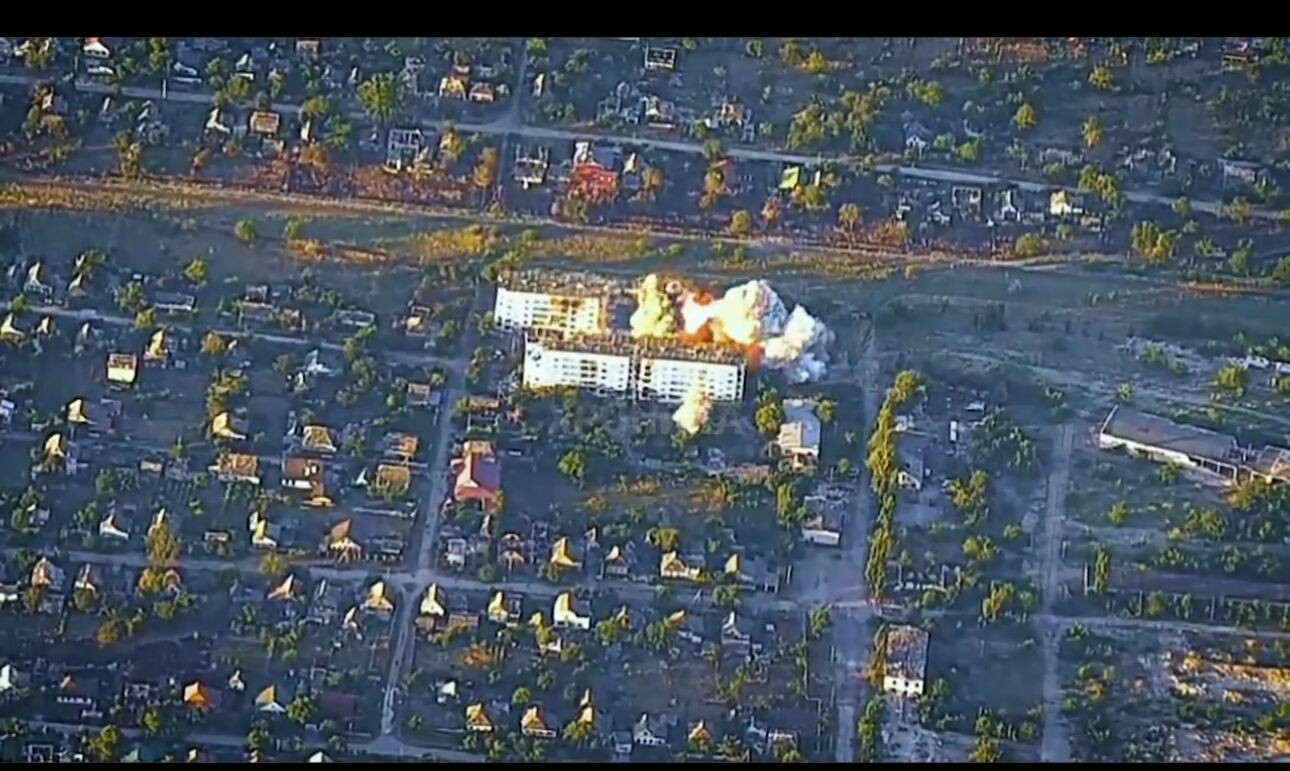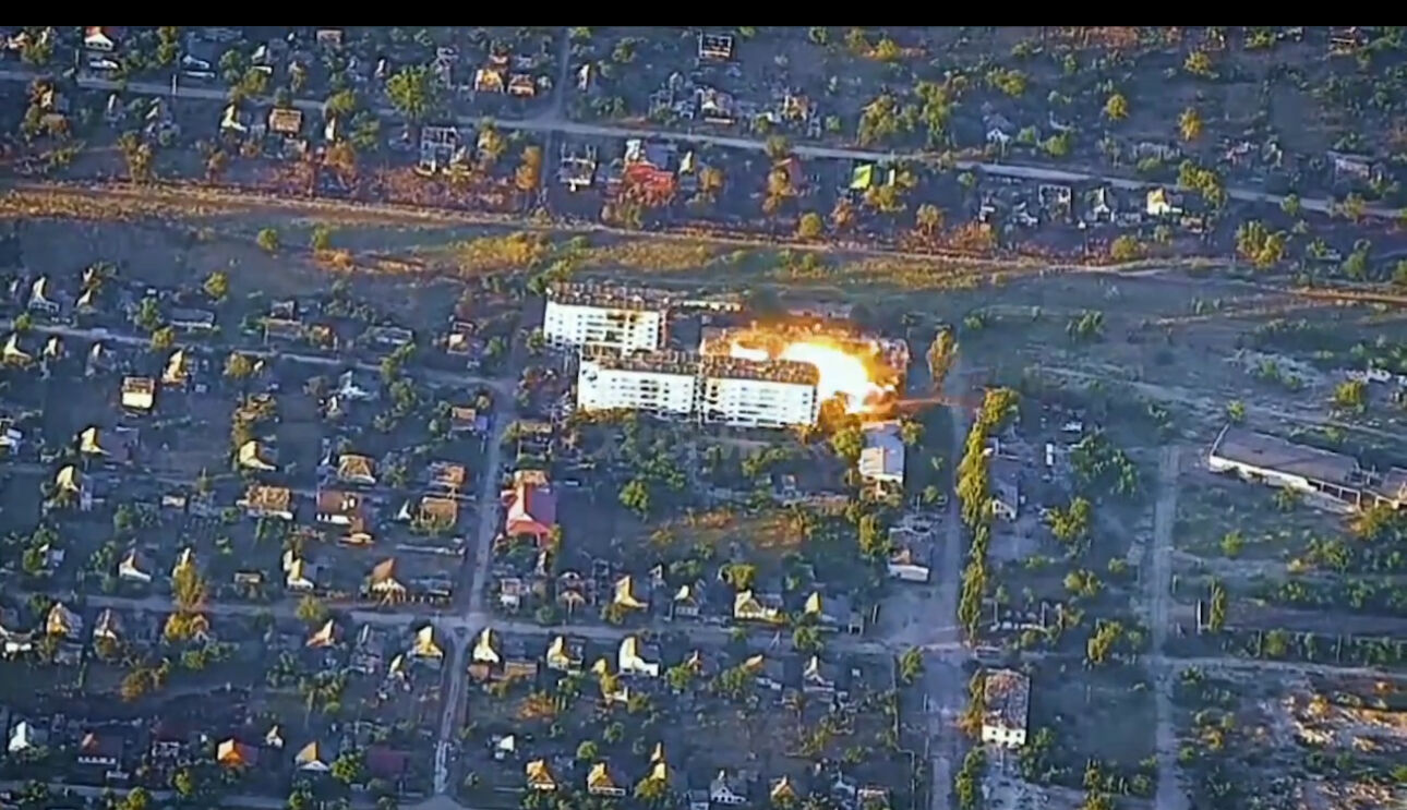 Cảnh quay bằng máy bay không người lái về lính xung kích Nga làm dấu trước khi tấn công vào một tòa nhà ở Toretsk.