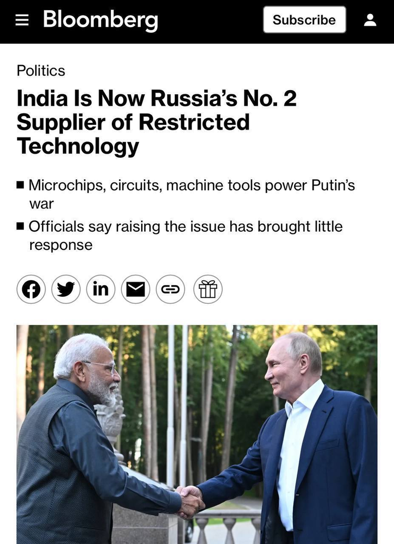 Ấn Độ trở thành quốc gia thứ hai sau Trung Quốc cung cấp công nghệ bị cấm cho Nga - Bloomberg
