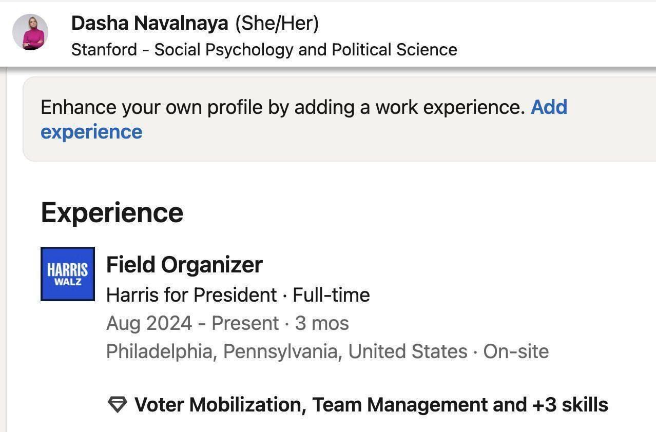 Daria Navalnaya đã đích thân công bố thông tin trên Linkedin. Một trong những nhiệm vụ của cô ấy là lãnh đạo/quản lý các tình nguyện viên chiến dịch.