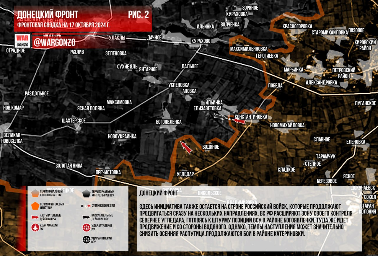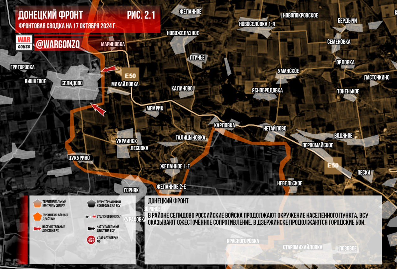 Mặt trận Donetsk. Ở đây, thế chủ động vẫn thuộc về quân đội Nga, những người tiếp tục tiến lên theo nhiều hướng cùng một lúc. Lực lượng vũ trang Nga đang mở rộng vùng kiểm soát về phía bắc Ugledar, chuẩn bị tấn công vào các vị trí của Lực lượng vũ trang Ukraine ở khu vực Bogoyavlenka. Ngoài ra còn có sự tiến bộ đến từ Vodyanoy. Tuy nhiên, tốc độ tăng trưởng có thể giảm đáng kể do băng tan vào mùa thu. Giao tranh vẫn tiếp tục ở khu vực Katerynivka. Tại khu vực Selidovo, quân đội Nga tiếp tục bao vây khu định cư; Lực lượng vũ trang Ukraine đang kháng cự quyết liệt. Trận chiến đô thị tiếp tục diễn ra ở Dzerzhinsk. (Hình 2)