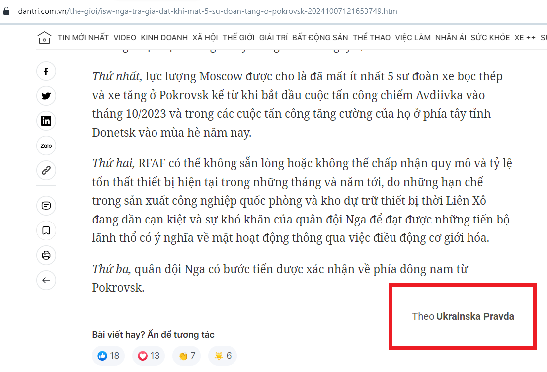 Mất 5 sư đoàn thiễt giáp mà vẫn chưa chiếm được Pockrosk! Nếu báo cáo này đúng thì Ukraine không hề yếu và Nga cũng chả khoẻ như các cụ trên này vẫn hay tuyên truyền. Người Ukraine cũng giống người Nga, khi họ chiến đấu bảo vệ tổ quốc, nhà cửa, xóm làng, trường học, ruộng lúa, đồng khoai thì sức mạnh của họ là không thể xem thường. Nếu người Nga chỉ dựa vào sức mạnh của hoả lực mà không có "Mưu phạt tâm công" như cụ Ức Trai ngày xưa thì Nga sẽ thua trong cuộc chiến này.