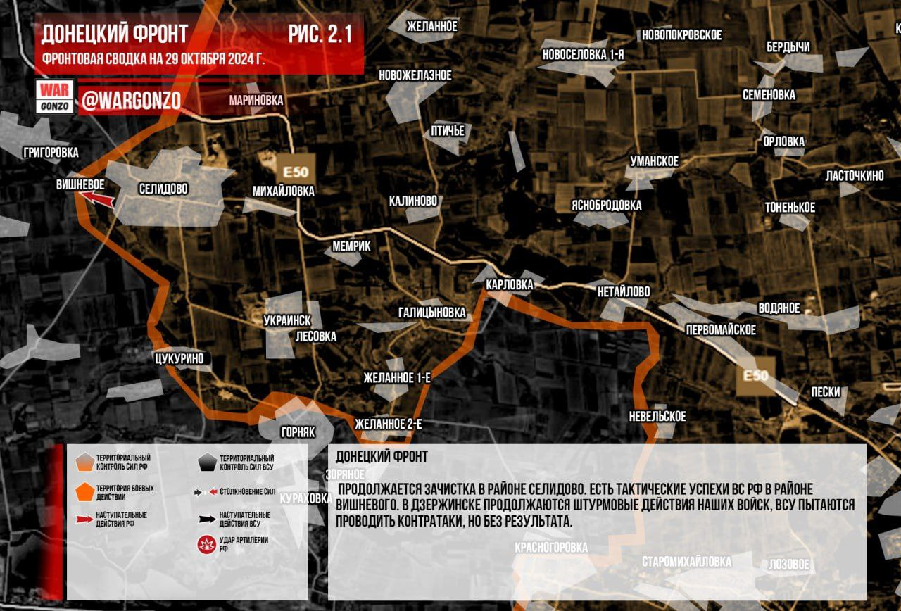 Mặt trận Donetsk. Quân Nga tiến vào Katerynivka, nắm quyền kiểm soát phần lớn ngôi làng. Việc dọn dẹp vẫn tiếp tục ở khu vực Selidovo. Có những thành công về mặt chiến thuật của Lực lượng vũ trang Nga ở khu vực Vishnevoye. Ở Dzerzhinsk, các hoạt động tấn công của quân đội Nga vẫn tiếp tục, Lực lượng vũ trang Ukraine đang cố gắng thực hiện các cuộc phản công nhưng vô ích. (Hình 2)