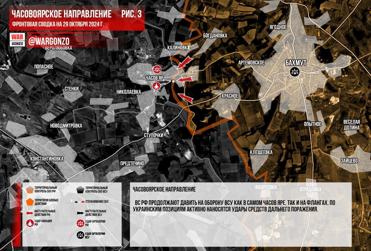 Hướng Chasovoyarsk. Lực lượng vũ trang Nga tiếp tục gây áp lực lên lực lượng phòng thủ của Lực lượng vũ trang Ukraine cả ở Chasov Yar và ở hai bên sườn. Các vị trí của Ukraine đang bị tấn công tích cực bằng vũ khí tầm xa. (Hình 3)