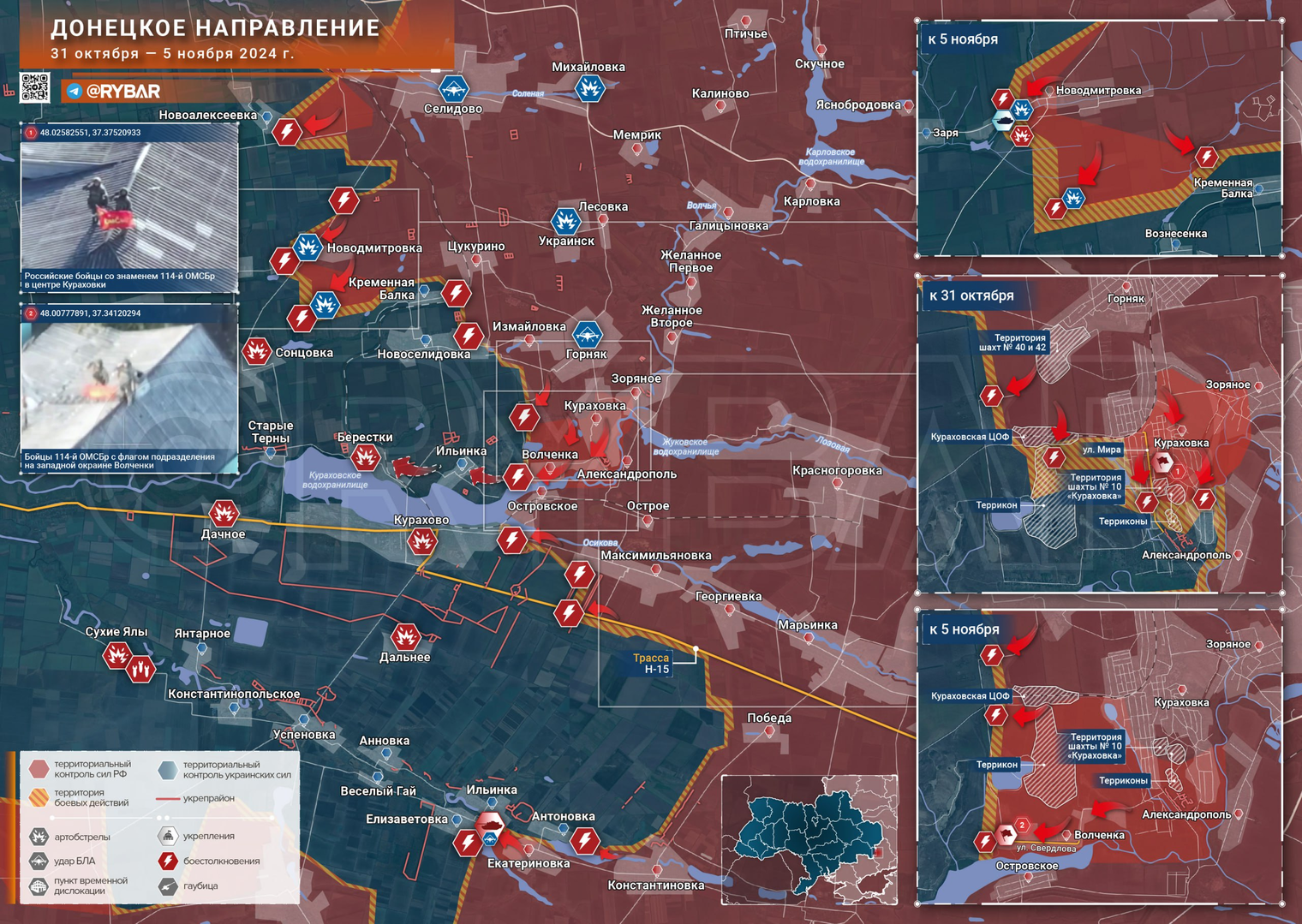- Ở phía đông nam, quân Nga giải phóng Kurakhovka. Vào cuối tháng 10, các đơn vị của Lữ đoàn súng trường cơ giới 114 đã treo cờ trên một trong những tòa nhà ở trung tâm làng; sự hiện diện của địch vẫn ở phía nam vùng hoang mạc; đống của tôi số 10. Mặc dù Bộ Quốc phòng Nga đã báo cáo cách đây vài ngày, nhưng chỉ gần đây mới xuất hiện xác nhận cuối cùng về việc thiết lập quyền kiểm soát đối với cả khu định cư và bãi thải gần đó của Cơ sở Điều phối Trung tâm Kurakhovskaya.