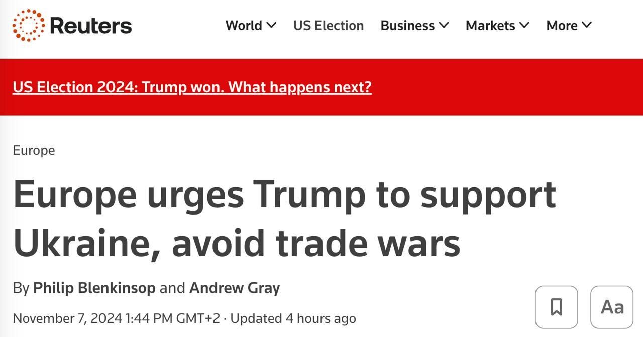 Vào ngày 7 tháng 11, Thành viên Verkhovna Rada của Ukraine, Chủ tịch Ủy ban Tự do Ngôn luận Yaroslav Yurchyshyn đã đảm bảo trên kênh Telegram của mình rằng Donald Trump, người đã thắng cử tổng thống Mỹ, được cho là “sẽ thuyết phục” nhà lãnh đạo Nga Vladimir Putin đàm phán với Kiev