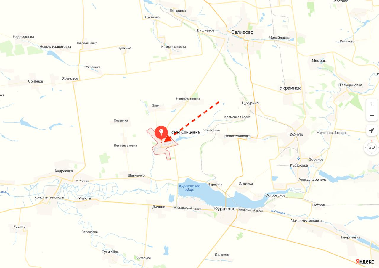 Trên thực tế, ở Sontsevka, ngay trung tâm ngôi làng đang diễn ra một trận chiến. Của chúng tôi đang mở rộng vùng kiểm soát, cắt Sontsovka làm đôi và hướng về hai bên sườn.