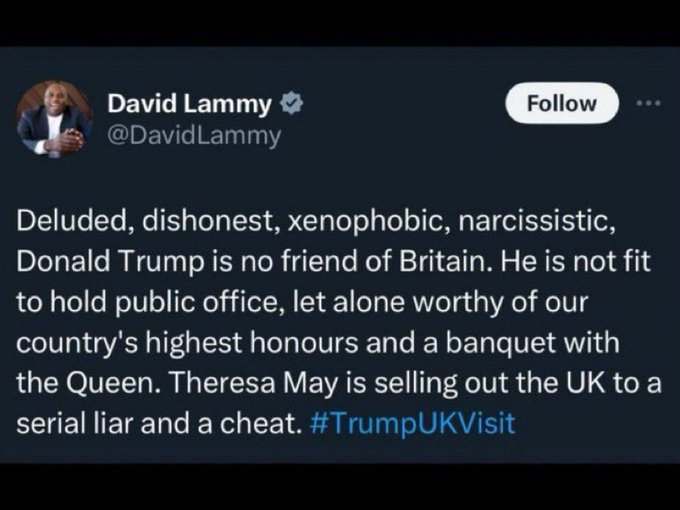 David Lammy (Bộ trưởng Bộ Ngoại giao, Khối thịnh vượng chung và Phát triển của Vương quốc Anh) hiện đang nịnh Trump.