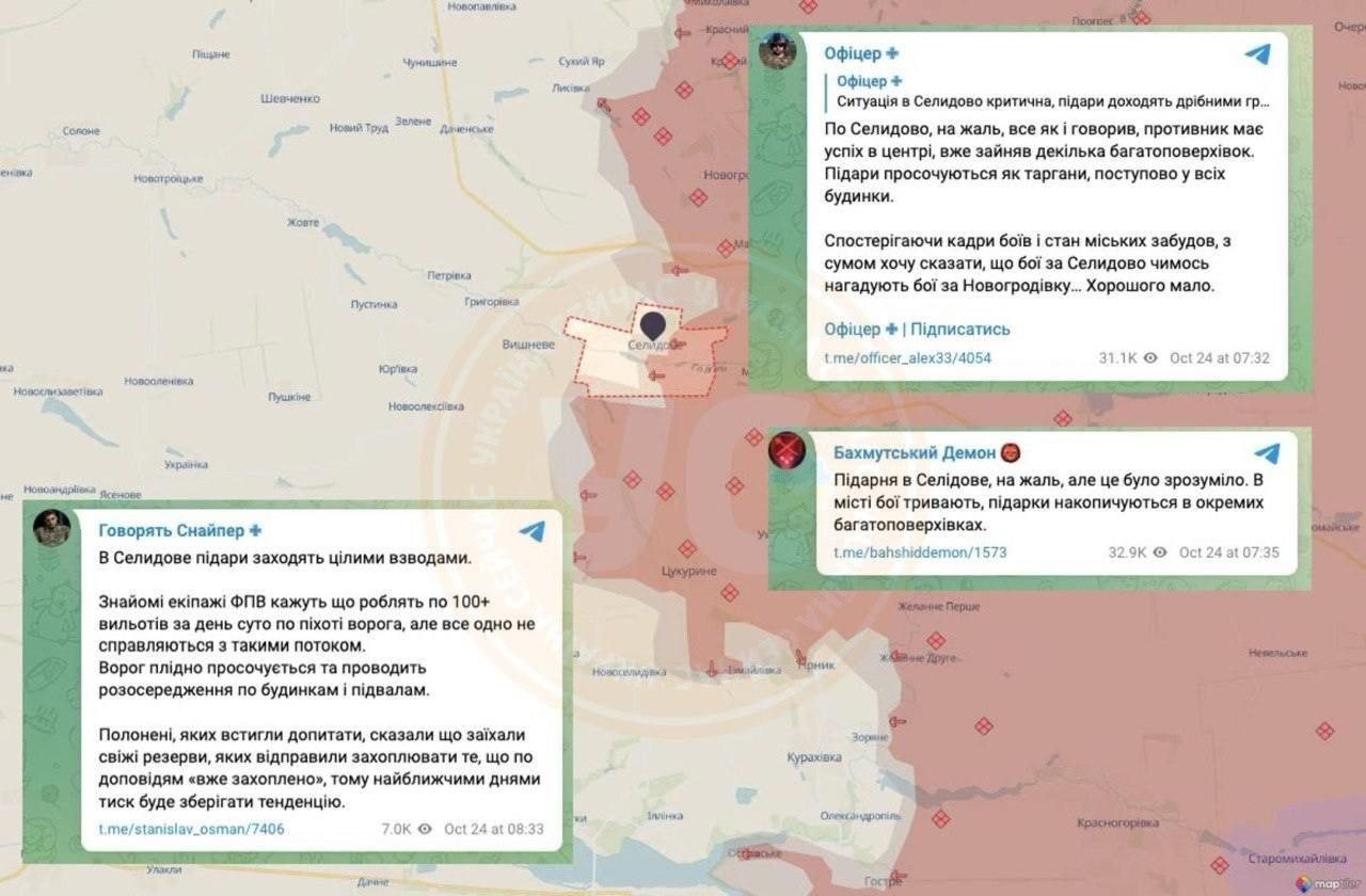 ➖"Theo Selidov, thật không may, mọi chuyện đúng như ông nói, quân Nga đang làm tốt ở trung tâm, đã chiếm được một số tòa nhà cao tầng. Quân Nga đang xâm nhập như gián, dần dần đến gần tất cả các ngôi nhà. Quan sát đoạn phim về vụ việc trận chiến và tình trạng phát triển đô thị, tôi buồn bã nói rằng các trận chiến ở Selidovo phần nào gợi nhớ đến các trận chiến ở Novogrodovka.”