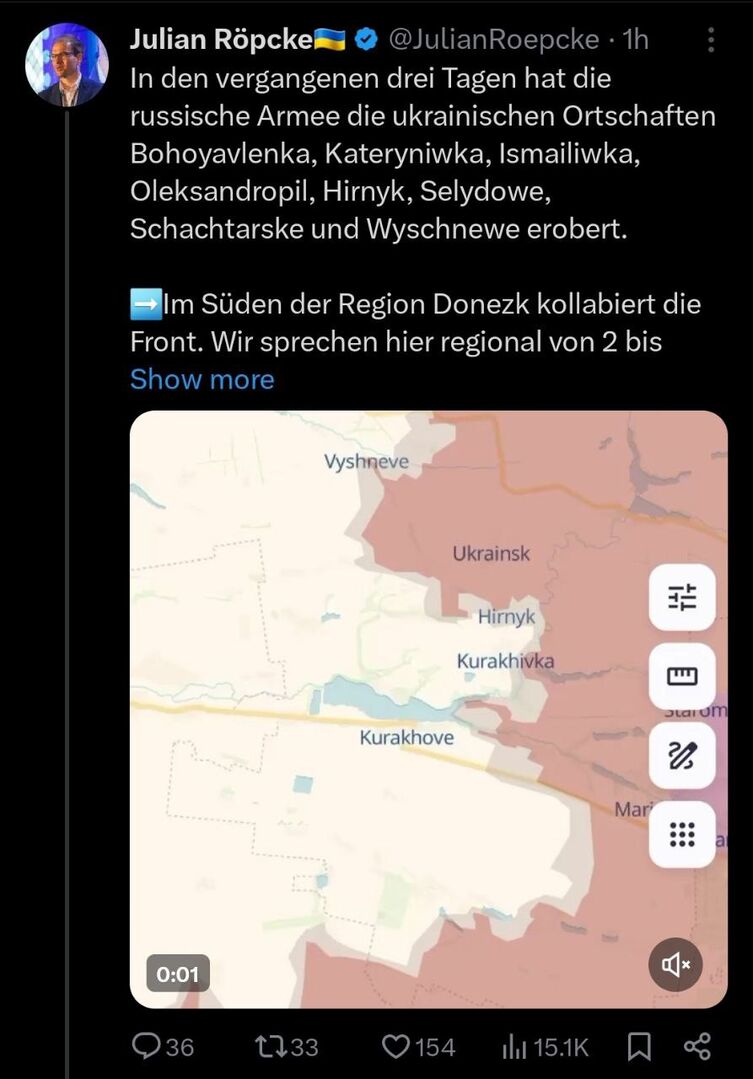 "Ở khu vực Donetsk phía nam, mặt trận đang sụp đổ. Trên quy mô khu vực, tổn thất khoảng 2 đến 5 km mỗi ngày. Với tốc độ này, Nga sẽ cần thêm 6 tháng nữa để đến được Tỉnh Dnepropetrovsk."