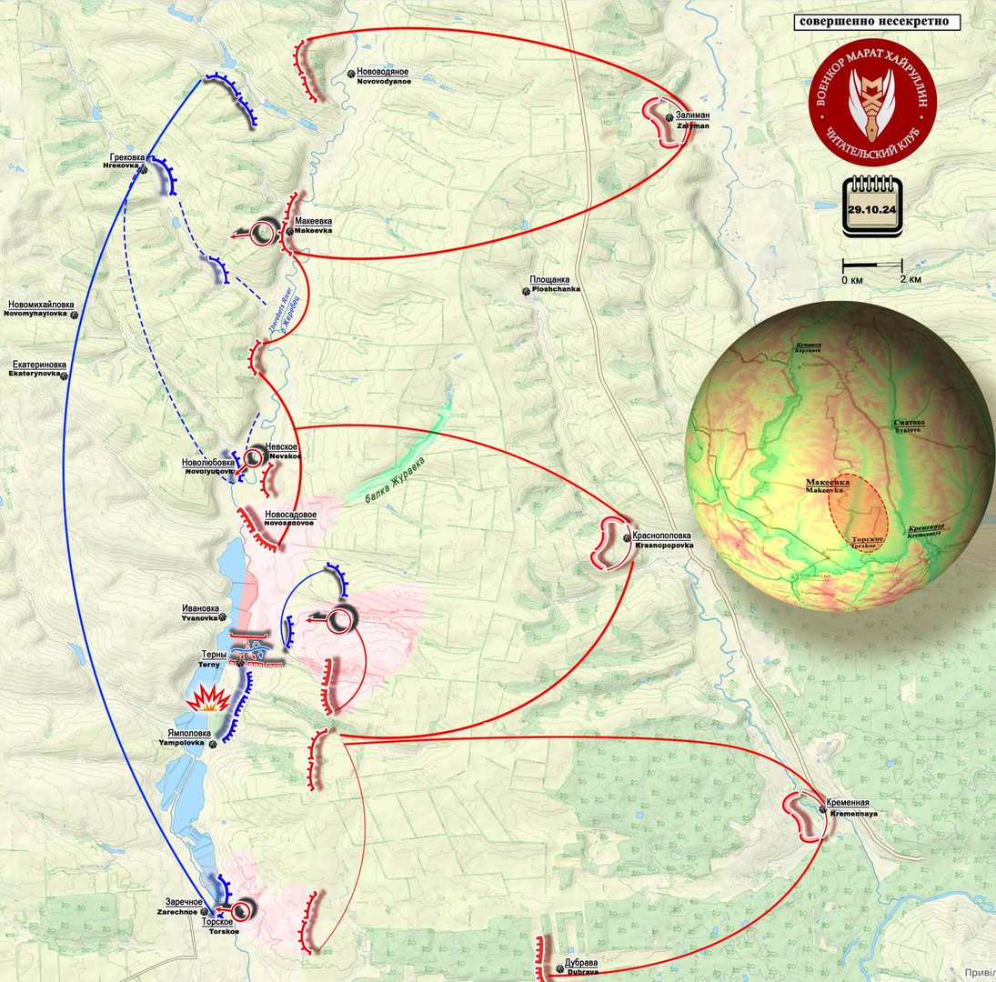 Tại khu vực Kremensky, quân đội Nga tiến vào làng. Terny, đã tiến lên từ khu định cư được giải phóng trước đó. Novosadovoe. Trong khu vực sau này, vùng kiểm soát trước đây đã được mở rộng đến phía nam khe núi Zhuravka, và Lực lượng vũ trang Ukraine bị giữ trong một “túi” khá hẹp. Với sự tiến bộ của chúng tôi, họ sẽ buộc phải rời khỏi “túi” này, vì trước đó họ đã rút lui khỏi mỏm đá giữa Makeyevka và Nevsky.