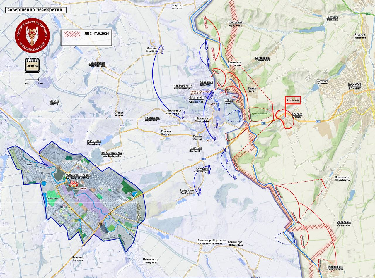 Tại Chasov Yar, giao tranh đang dần chuyển sang khu vực trung tâm, nơi Lực lượng vũ trang Ukraine đang cố thủ trong các tòa nhà cao tầng và trên lãnh thổ của nhà máy vật liệu chịu lửa Chasovyarsky. Trong tiểu khu Oktyabrsky, kẻ thù đã bị đánh bật ra khỏi các tòa nhà của trường số 17 và tiến về phía tây của trường trong khu vực tư nhân. Về phía Nam, trường mẫu giáo số 48 và khu tư nhân ven rừng do đơn vị ta quản lý.