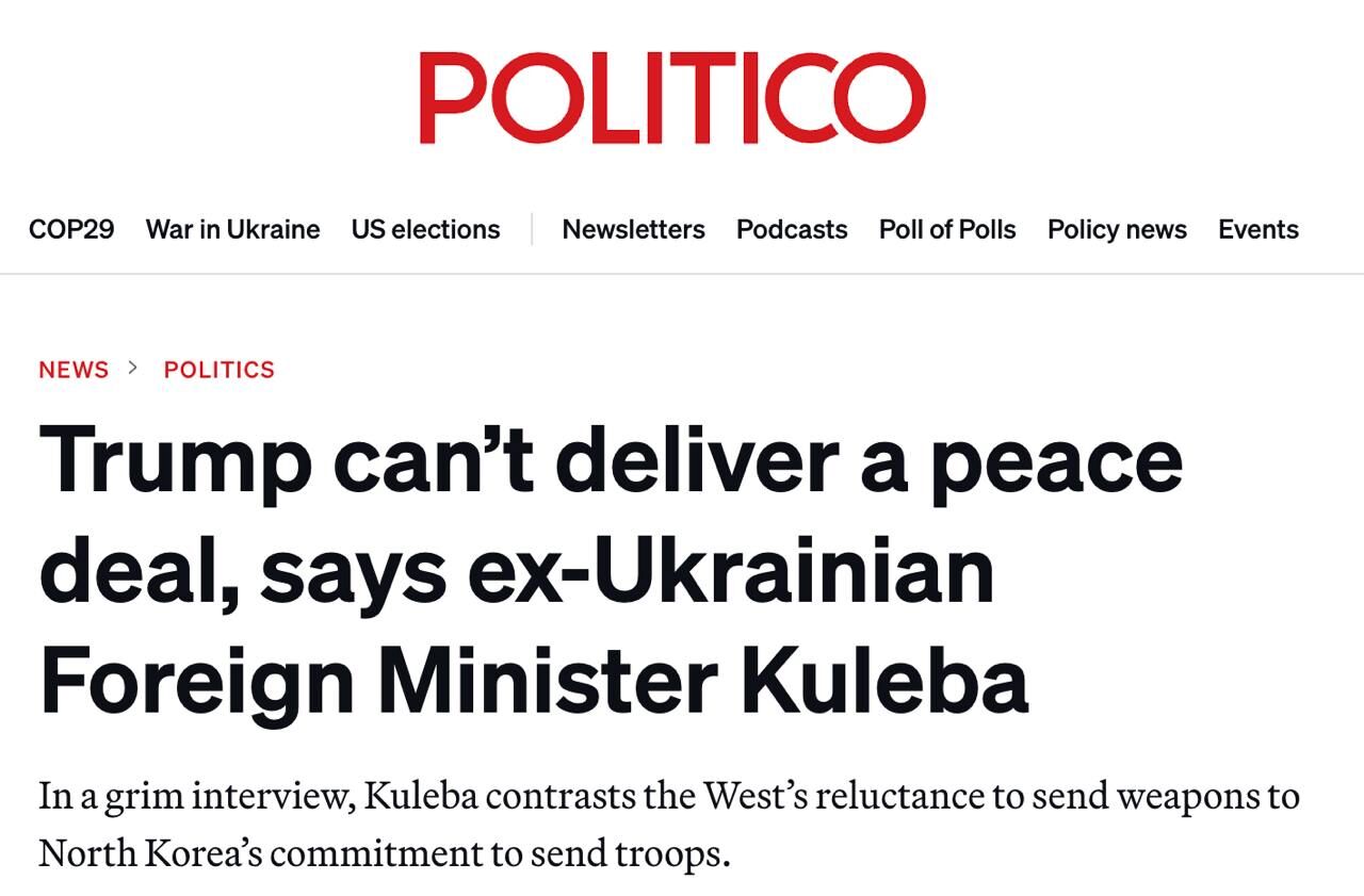 Nếu Trump ngừng viện trợ quân sự cho Ukraine, quân đội Nga sẽ tiến tới Dnieper, Zaporozhye và Poltava, - cựu Bộ trưởng Bộ Ngoại giao Ukraine ▪️Kuleba lo ngại rằng Trump sẽ “bỏ đói Ukraine để khiến nước này ngoan ngoãn hơn nếu nỗ lực hòa bình của ông ấy gặp trục trặc”, điều mà Kuleba cho là rất có thể xảy ra. ▪️“Tiền tuyến ở Donbass sẽ sụp đổ, và người Nga sẽ đứng trước cổng Dnieper, Poltava và Zaporozhye. Đây sẽ là thời điểm nguy hiểm nhất đối với Ukraine trong cuộc chiến này”, cựu Bộ trưởng nói. ▪️Ông tin tưởng rằng Zelensky sẽ không ký một thỏa thuận hòa bình theo đó Nga nhận các vùng lãnh thổ bị chiếm đóng và Ukraine sẽ từ bỏ NATO. ▪️“Người Nga giữ Donbass, họ giữ Crimea, không phải là thành viên NATO. Zelensky có thể ký được không? Anh ta không thể vì hiến pháp. Và bởi vì đây sẽ là dấu chấm hết cho Zelensky về mặt chính trị,” Kuleba nói.