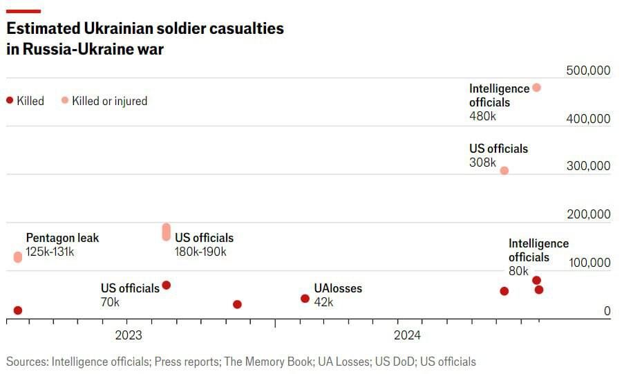 Hơn 500 nghìn binh sĩ Lực lượng Vũ trang Ukraine đã chết hoặc bị thương nặng và sẽ không thể chiến đấu được nữa, - The Economist ▪️Ít nhất 100 nghìn binh sĩ Ukraine thiệt mạng trong cuộc chiến với Liên bang Nga, khoảng 400 nghìn người nữa bị thương nặng và không thể chiến đấu được nữa ▪️Những số liệu này chỉ tính đến tổn thất quân sự. Ấn phẩm đã nghiên cứu nhiều nguồn khác nhau để cố gắng xác định tổn thất của Lực lượng Vũ trang Ukraine, những tổn thất này không được tiết lộ chính thức. ▪️ Hãy để chúng tôi nhắc bạn rằng Zelensky đã nói vào tháng 2 rằng 30 nghìn binh sĩ Ukraine đã chết ở mặt trận.