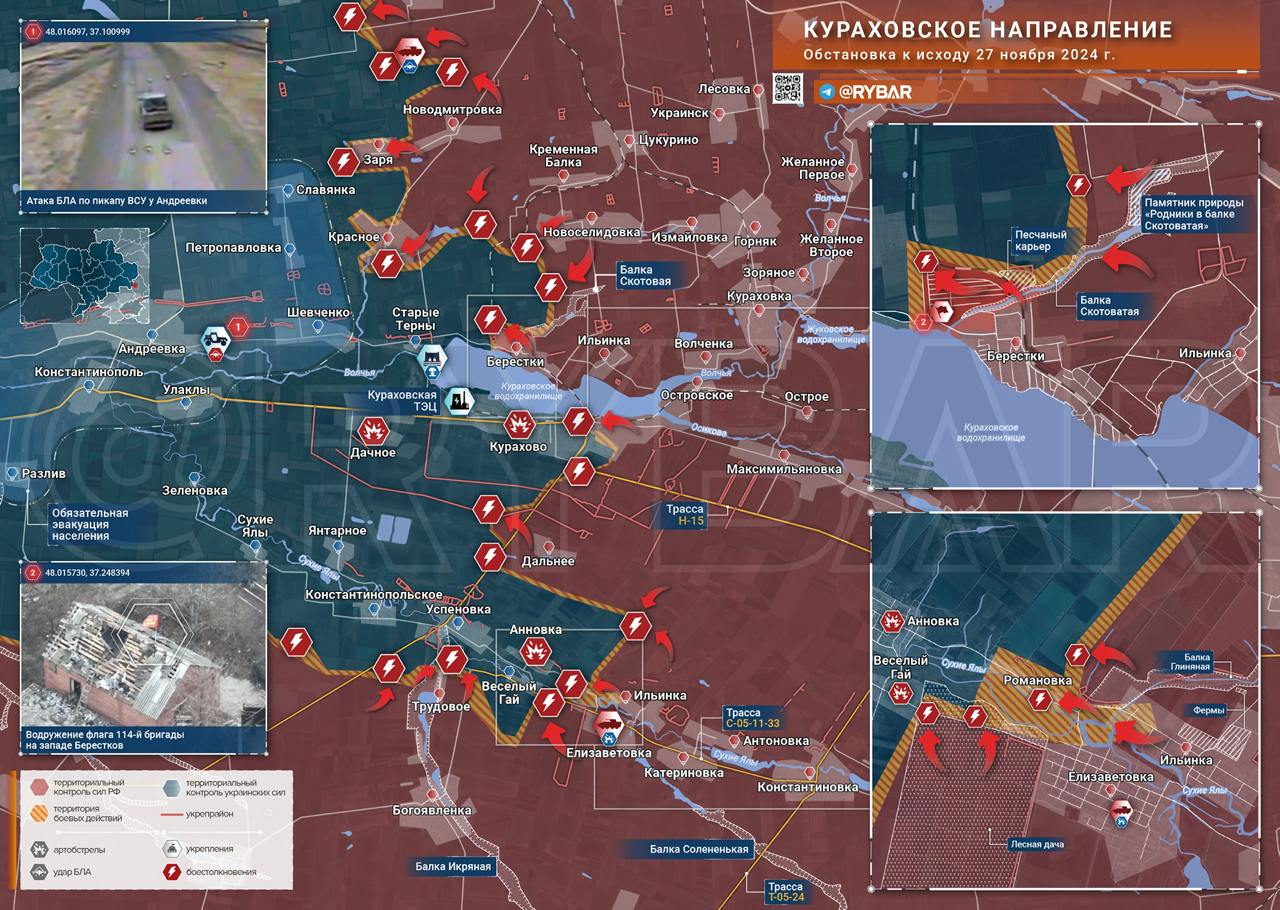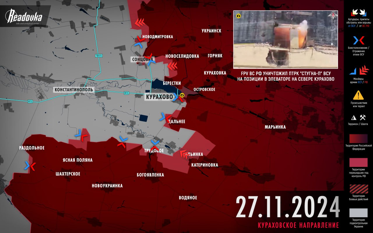 Theo hướng Kurakhove, theo đoạn phim kiểm soát khách quan, Lực lượng vũ trang Nga đã giải phóng hoàn toàn Berestky. Về phía nam, giao tranh vẫn tiếp tục diễn ra ở Kurakhove và dọc theo phòng tuyến Romanovka - Konstantynopilske.