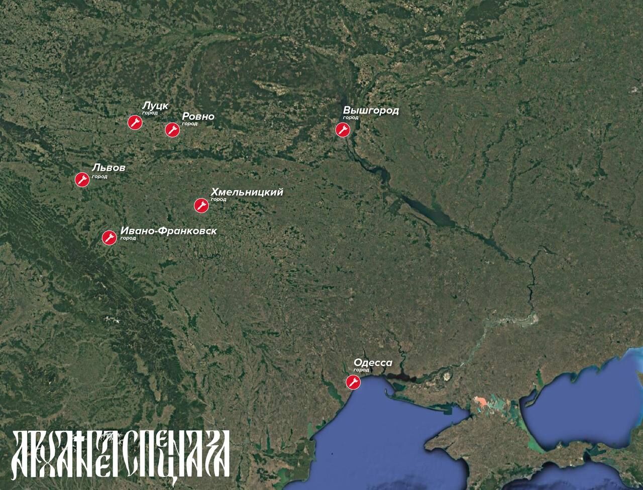 Những người đến đã được báo cáo ở Lviv, Lutsk, Rivne, Khmelnitsky, Ternopil, Ivano-Frankivsk và Vyshgorod. Có một nhà máy thủy điện của Ukraine ở Vyshgorod và có lẽ đây có thể là mục tiêu của cuộc tấn công.