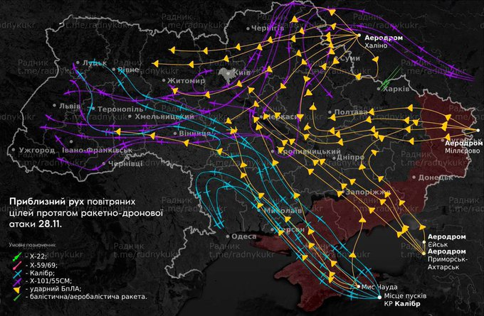 Bản đồ đường bay của tên lửa và UAV Nga trong cuộc tấn công tên lửa buổi sáng vào Ukraine ▪️Truyền thông đối phương đưa tin rằng hầu hết các cuộc tấn công đều được thực hiện vào các cơ sở năng lượng. ▪️Có khoảng 25 tên lửa bay lên cùng lúc ▪️Đang mất điện trên toàn Ukraina.