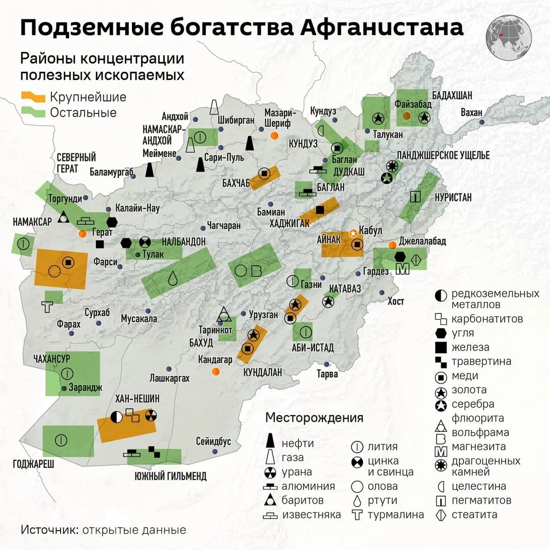 ▪️Đất giàu dinh dưỡng nhất. Dự trữ sắt ở Afghanistan ước tính khoảng 421 tỷ USD, đồng - 274 tỷ USD, niobi - 81,2 tỷ USD, coban - 24 tỷ USD, vàng - 25 tỷ USD. Tổng giá trị tài nguyên khoáng sản là khoảng 1-3 nghìn tỷ USD. Và đây chỉ là 30% lãnh thổ mà người Mỹ đã khám phá. Nước này cũng có trữ lượng dầu khí.