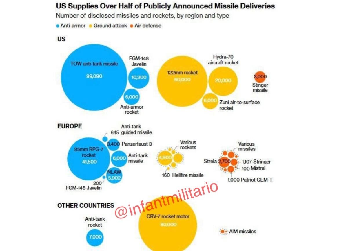 Ấn phẩm này viết rằng Kyiv đã chuyển hoàn toàn từ hệ thống của Liên Xô sang hệ thống của phương Tây, khiến nước này phụ thuộc vào nguồn cung cấp từ Washington. Đồng thời, Nga sản xuất nhiều đạn pháo hơn toàn bộ châu Âu cộng lại.