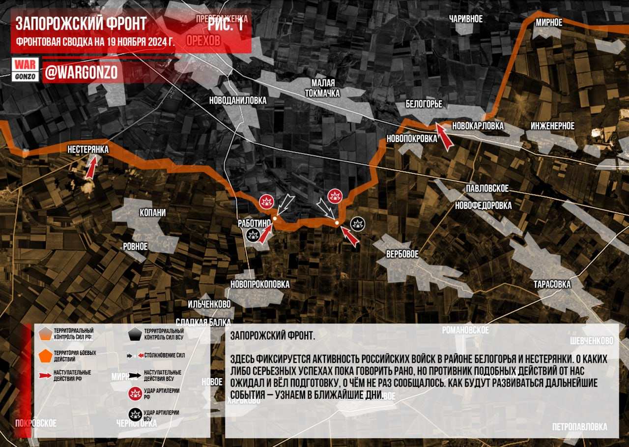 Mặt trận Zaporozhye. Hoạt động của quân đội Nga tại khu vực Belogorye và Nesteryanka được ghi lại tại đây. Còn quá sớm để nói về bất kỳ thành công lớn nào, nhưng kẻ thù đã chờ đợi những hành động như vậy từ quân đội Nga và đã có sự chuẩn bị, điều này đã nhiều lần được báo cáo. Chúng ta sẽ tìm hiểu xem các sự kiện tiếp theo sẽ phát triển như thế nào trong những ngày tới. (Hình 1)