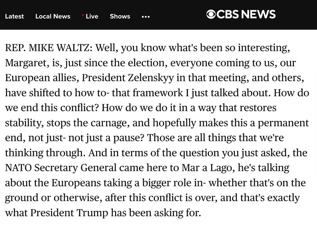 ▪️Cố vấn An ninh Quốc gia của Tổng thống trong tương lai Michael Waltz nói rằng “kiểm tra trống” (hỗ trợ không giới hạn) “không phải là một chiến lược”.