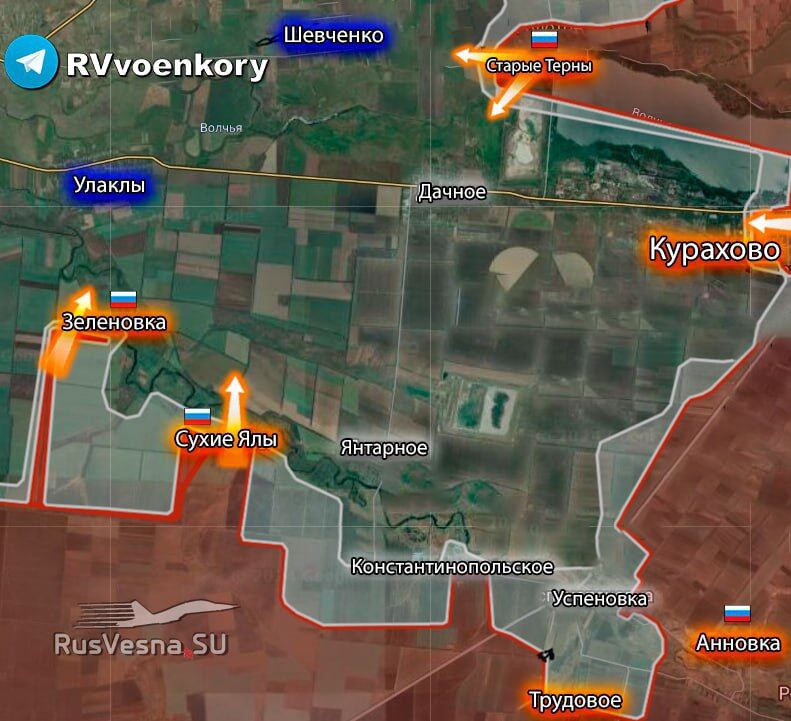 ▪️Theo ông, các lực lượng vũ trang đã giành được chỗ đứng ở khu vực Sukhoi Yalov và Zelenovka, sau đó họ sẽ cố gắng cắt đường cao tốc chính đến Kurakhovo - gần làng Ulakly.