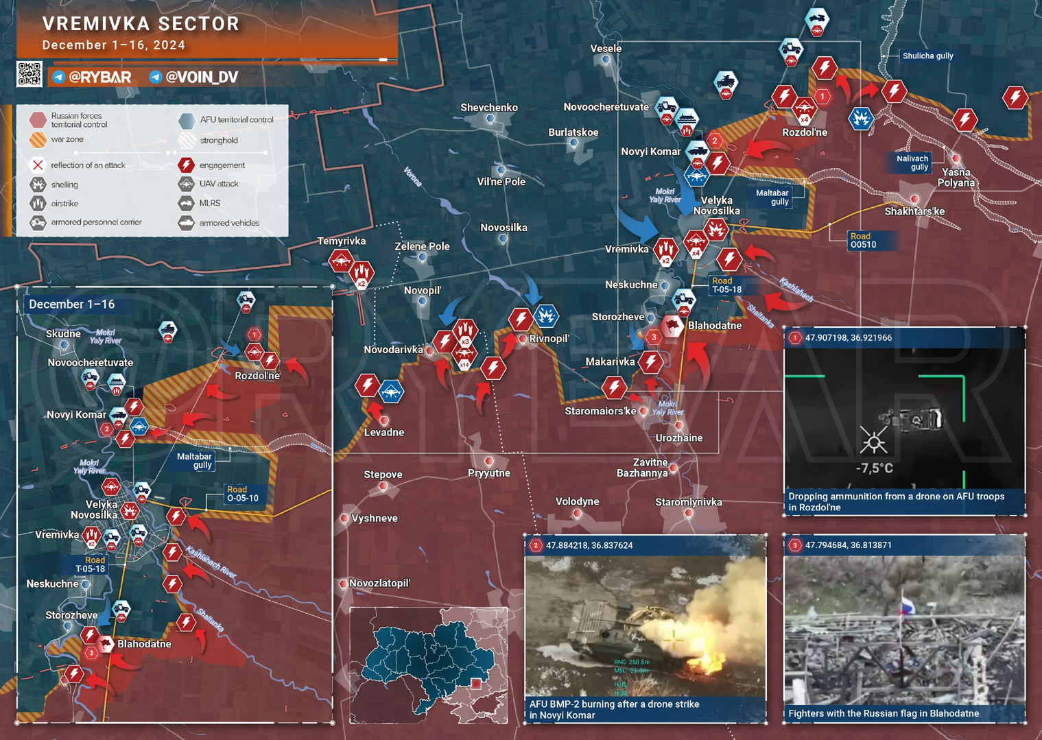 Theo hướng Vremyevsk, quân đội Nga vẫn tiếp tục bao vây Bolshaya Novosyolka, tình hình đồn trú của quân đội Ukraine tại đây ngày càng trở nên tồi tệ hơn.
