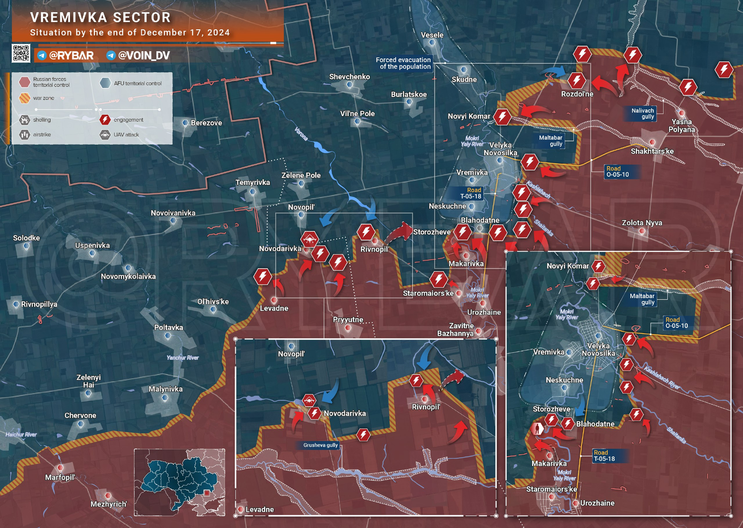 Theo hướng Vremivka, các đội tấn công của Lực lượng vũ trang Nga đang tiến về phía bắc Makarovka, có những trận chiến ở Blahodatne và Storozheve.