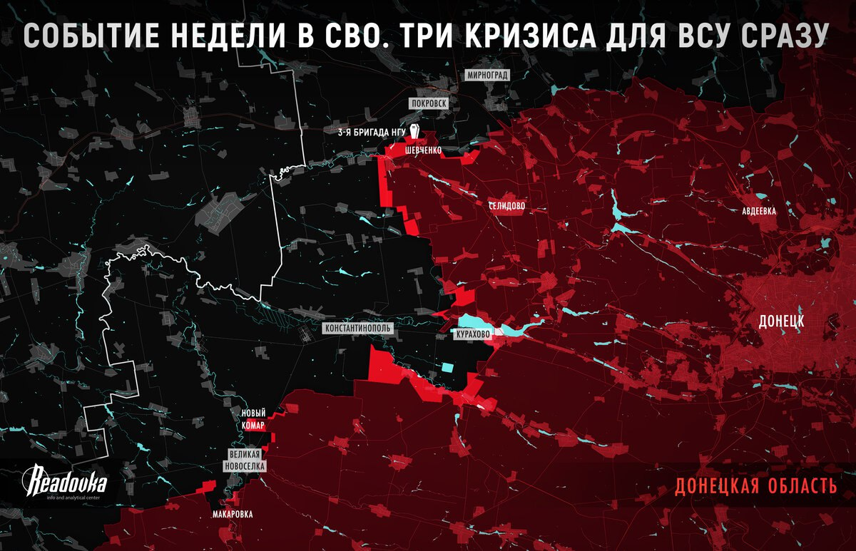 Trong suốt một tuần, Lực lượng vũ trang Ukraine đã gặp phải ba điểm khủng hoảng trên mặt trận ở DPR. Cuộc tấn công chớp nhoáng của nhóm tấn công Nga vào Novy Komar đã kết thúc bằng việc chiếm được ngôi làng. Về phía nam, Lực lượng vũ trang Nga đã chiếm được Makarovka, và kết quả là vòng vây quanh Velikaya Novosyolka bắt đầu thắt chặt. Về phía bắc, quân đội Nga đang tiến đến Constantinople và Zelenovka - chỉ còn 2 km nữa là đến con đường bình thường cuối cùng ở phía tây Kurakhovo. Đáng mong đợi là kẻ thù sẽ sớm buộc phải đóng “túi” Kurakhove.