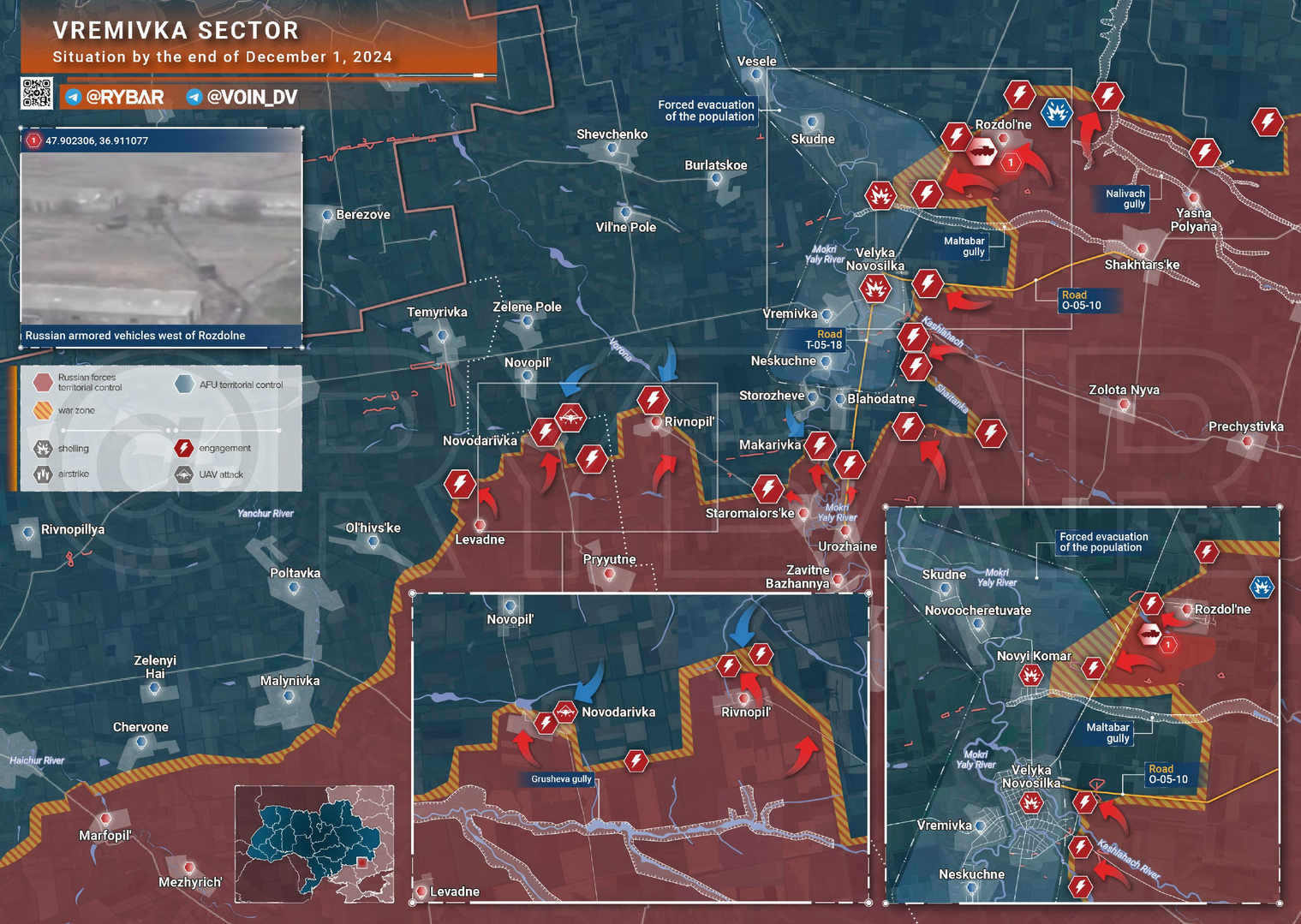 Theo hướng Vremivka, quân nhân quân đội Nga đã tham gia vào các trận chiến ở vùng ngoại ô phía đông của Novyi Komarov, mở rộng vùng kiểm soát về phía tây nam Razdolne. Về phía nam, họ tiến về phía Blahodatne.