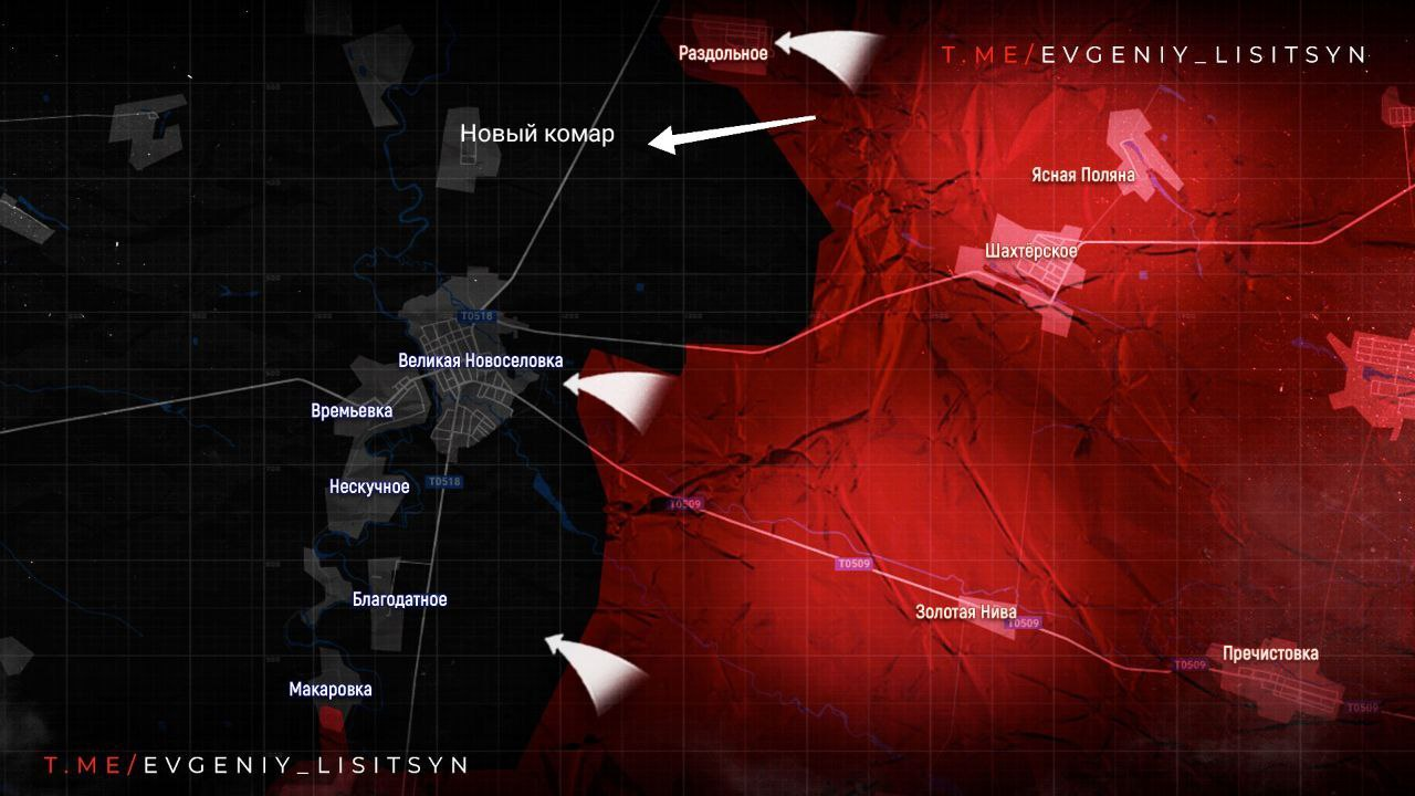 🗣Ở hướng Nam Donetsk, đã phát triển của chúng ta đã không dừng lại sau khi giải phóng Razdolny và tiếp tục tiến lên, tạo ra mối đe dọa bao trùm hoàn toàn Velikaya Novoselka, tấn công từ phía bắc gần làng Novy Komar. Một con đường khác đến Bolshaya Novosyolka cũng bị cắt đứt theo cách này. Trong số những con đường trải nhựa, Lực lượng vũ trang Ukraine chỉ còn một con đường - từ phía tây từ Gulyai-Polye. Nhưng nó nằm dưới sự kiểm soát hỏa lực của chúng tôi.