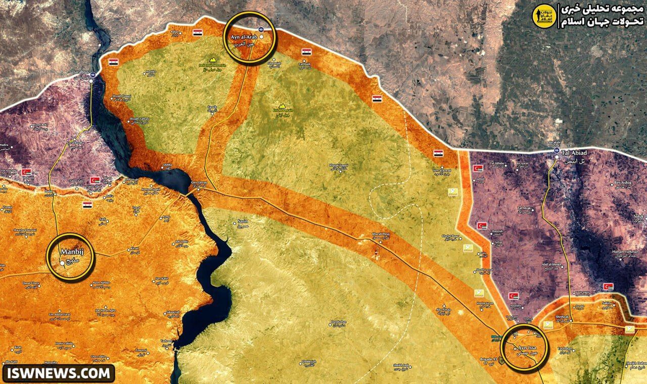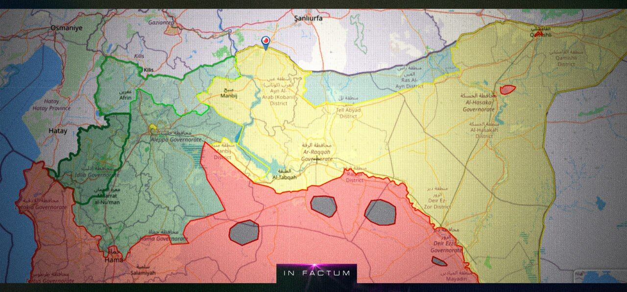 Các lực lượng của quân đội Syria và Nga đang rút khỏi mặt trận Ain Arab (Kobani) và Ain Isa ở miền bắc Syria, truyền thông Ả Rập viết. Đoạn video trên cho thấy quân đội di chuyển từ các khu vực do Lực lượng Dân chủ Syria (SDF) kiểm soát đến phía sau thủ phủ tỉnh Raqqa. Điều này có thể là do một cuộc tấn công sắp tới của các nhóm khủng bố được Thổ Nhĩ Kỳ hậu thuẫn, Những kẻ khủng bố Jaysh al-Watani (Quân đội Quốc gia Syria - SNA) dự kiến sẽ sớm tấn công các thành phố Ain Arab, Ain Isa và Manbij ở miền bắc Syria với sự yểm trợ bằng không quân và pháo binh của quân đội Thổ Nhĩ Kỳ. Khu vực có trung tâm là Kobane không cho phép Thổ Nhĩ Kỳ tạo ra một vùng biên giới liên tục ở miền bắc Syria. Bản đồ hiển thị các vùng đất xanh ở phía tây và phía đông, với Kobani ở giữa. Điều này được xác nhận bởi các báo cáo rằng Türkiye đang đưa quân đến biên giới phía bắc Syria.