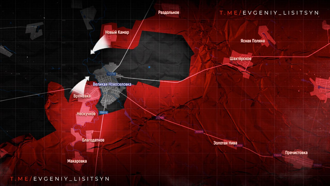 🗣Theo hướng Velikonovoselovsky, Lực lượng vũ trang Nga đã giải phóng Vremevka. Quân ta tiến dọc theo phố chính của làng – Partizanskaya – và đột phá vào tuyến phòng thủ của địch. Con phố này dẫn đến cây cầu chia đôi Vremevka và Velikaya Novoselka, tức là nó chặn mọi lối ra khỏi làng.