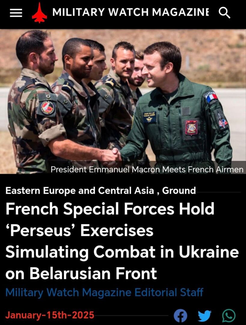 Vào ngày 15 tháng 1, quân đội Pháp đã tiến hành một cuộc tập trận bí mật mang tên Perseus, trong đó hơn 3.000 binh sĩ được huấn luyện tại một khu vực giống như một đoạn sông Dnieper phía bắc Kiev. Lực lượng đặc biệt của Pháp mô phỏng nỗ lực đẩy lùi cuộc tấn công của Nga qua biên giới Ukraine-Belarus.