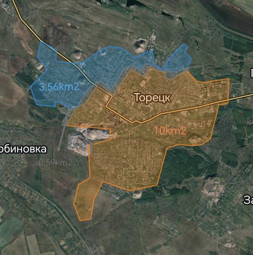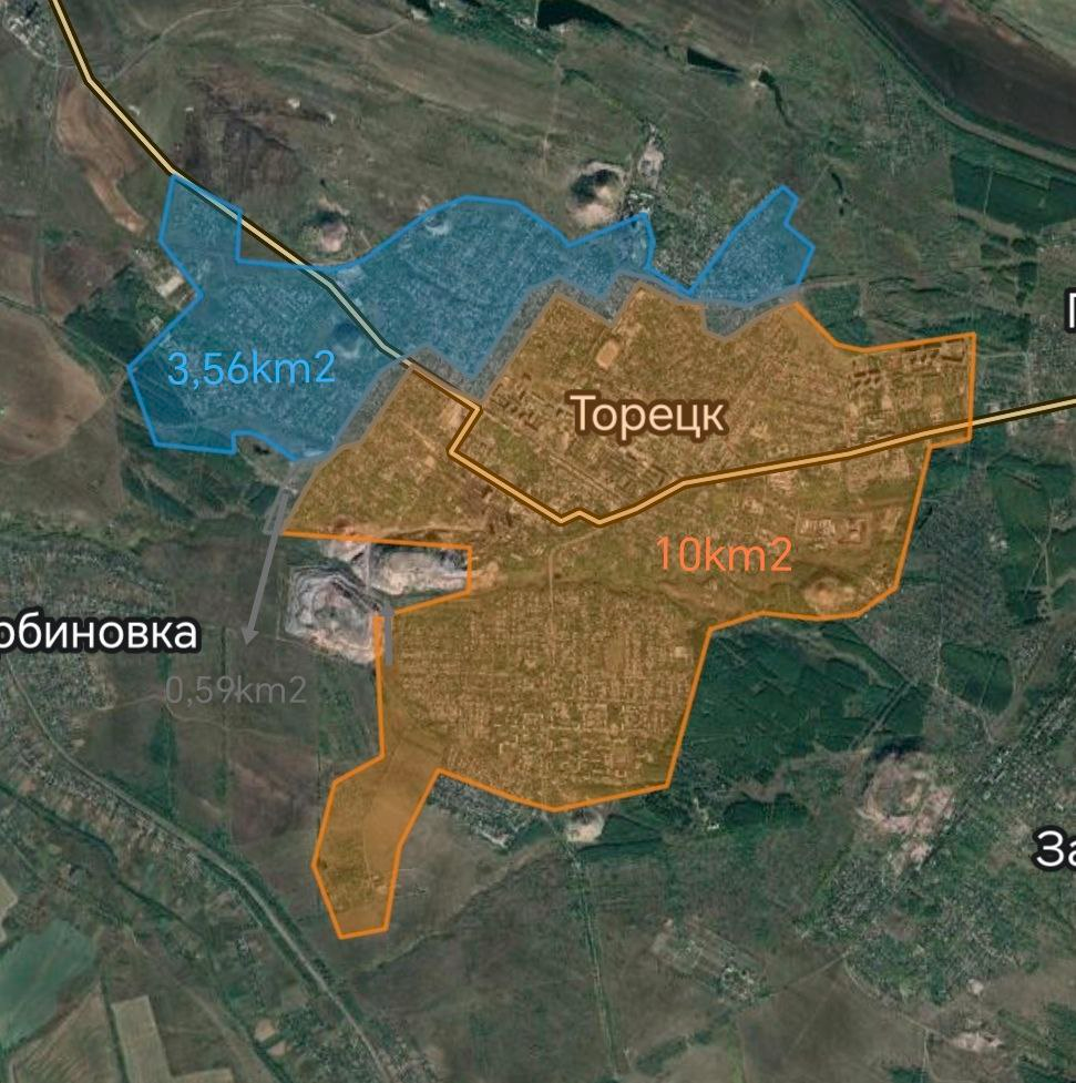 Các khu vực kiểm soát của 2 bên tại Toretsk (Dzerzhinsk) vào cuối năm 2024. Việc giải phóng Dzerzhinsk không chỉ cần thiết về mặt mở đường đến Konstantinovka mà còn để làm dịu tình hình ở Gorlovka, nơi Ukraine vẫn liên tục pháo kích, nhận ra rằng chúng sẽ sớm mất cơ hội này.