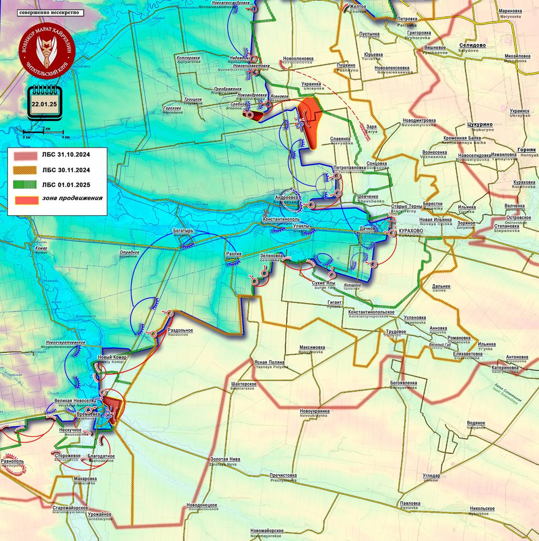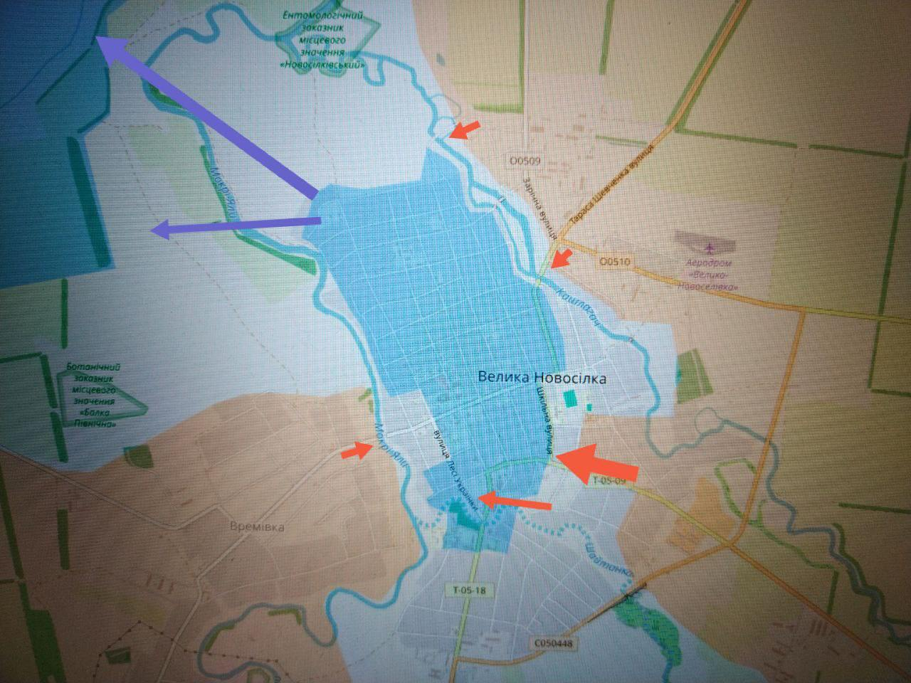 Tại khu vực Velikaya Novosyolka, Lực lượng vũ trang Nga đã thiết lập được chỗ đứng ở phía nam, gần ngay cạnh ngôi làng, gia tăng sức ép lên Lực lượng vũ trang Ukraine tại khu vực Velikaya Novosyolka bị ngăn cách bởi sông Shaitanka. Khó khăn trong việc cung cấp cho Lực lượng vũ trang Ukraine, liên quan đến nhu cầu vượt sông qua một vài điểm giao cắt, sẽ không cho phép kẻ thù giữ các vị trí ở phía nam của ngôi làng trong thời gian dài và sẽ buộc chúng phải rút lui về bờ bắc của Shaitanka ở phần trung tâm của khu định cư. Cùng lúc đó, các đơn vị của chúng tôi đang ngày càng cố thủ chặt chẽ hơn ở khu vực trung tâm của ngôi làng, giữa sông Shaitanka và sông Kashlagach. Cuộc giao tranh diễn ra ở khu vực trường học và sân vận động, dần dần tiến vào khu vực trung tâm.