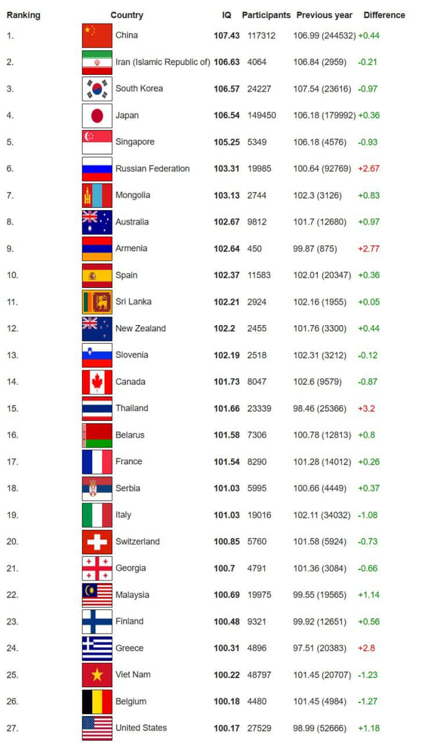 Theo xếp hạng mới nhất năm 2025 của International IQ registry về chỉ số trí tuệ của người dân 127 quốc gia, IQ trung bình của người Nga đang ở vị trí số 1 châu Âu, IQ trung bình của người Ukraina cũng ở vị trí số 1 châu Âu, nhưng ở chiều … ngược lại!