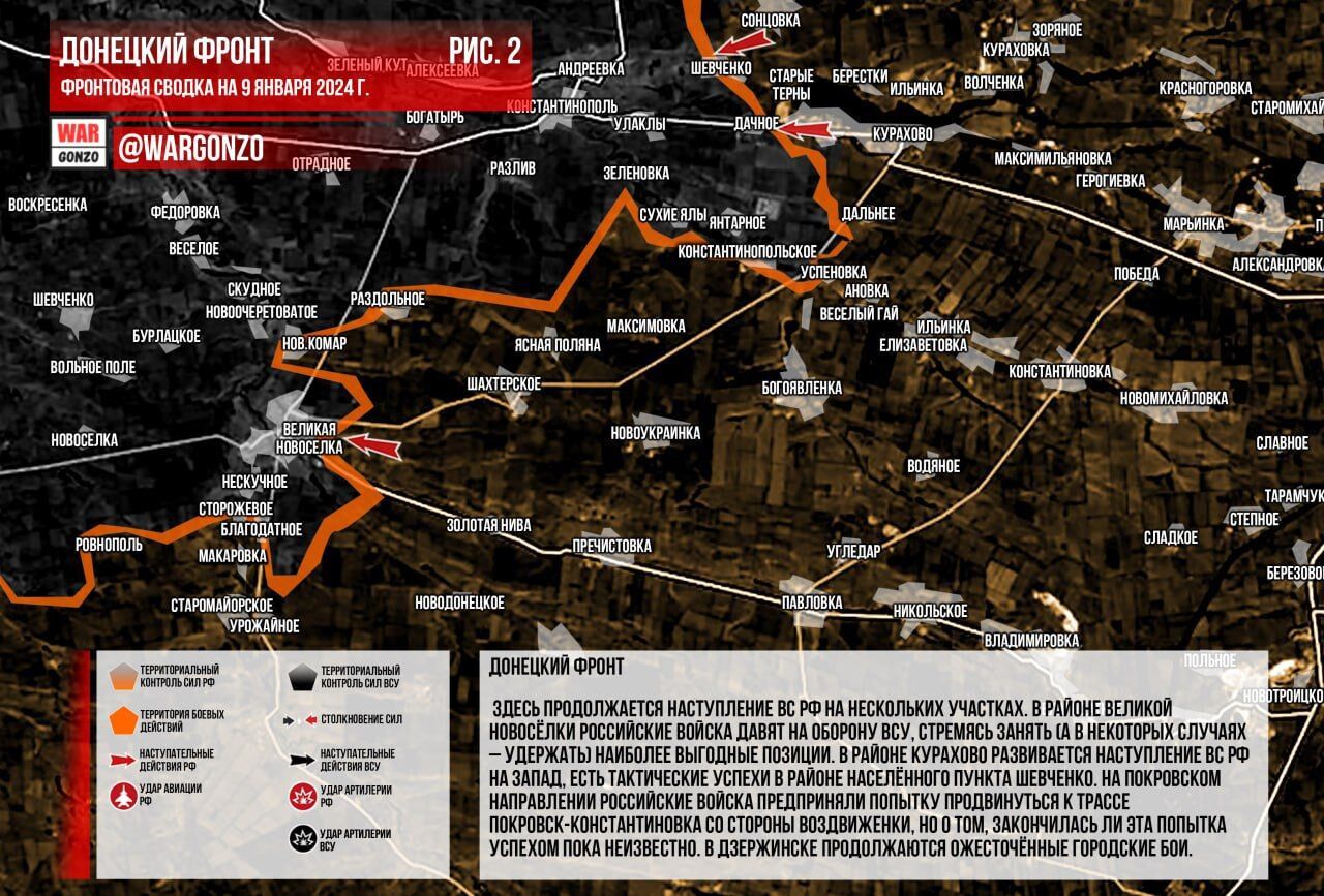 Mặt trận Donetsk. Cuộc tấn công của Lực lượng vũ trang Nga vẫn tiếp tục ở nhiều khu vực. Tại khu vực Velikaya Novosyolka, quân đội Nga đang gây sức ép lên hệ thống phòng thủ của Lực lượng vũ trang Ukraine, cố gắng chiếm giữ (và trong một số trường hợp là giữ vững) những vị trí có lợi nhất. Tại khu vực Kurakhovo, Lực lượng vũ trang Nga đang tiến về phía tây và đã đạt được những thành công về mặt chiến thuật tại khu vực định cư Shevchenko. Theo hướng Pokrovsk, quân đội Nga đã cố gắng tiến về phía đường cao tốc Pokrovsk-Konstantinovka từ hướng Vozdvizhenka, nhưng vẫn chưa biết liệu nỗ lực này có thành công hay không. Giao tranh ác liệt vẫn tiếp diễn ở Dzerzhinsk. (Hình 2)
