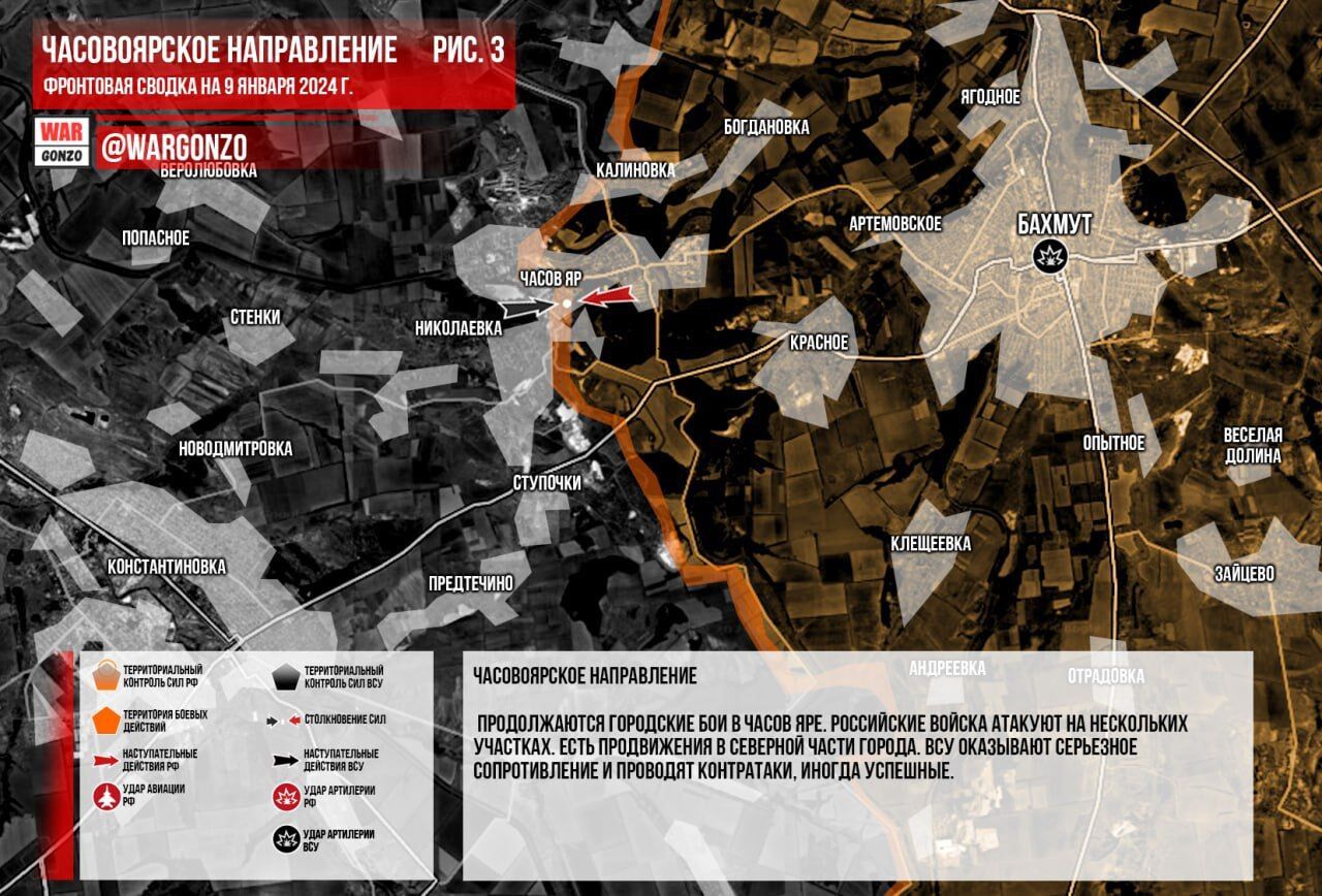 Hướng Chasovoyarsky. Giao tranh trong đô thị vẫn tiếp diễn ở Chasov Yar. Quân đội Nga đang tấn công vào một số khu vực. Có những tiến bộ ở phía bắc thành phố. Lực lượng vũ trang Ukraine đang kháng cự quyết liệt và tiến hành phản công, đôi khi thành công. (Hình 3)