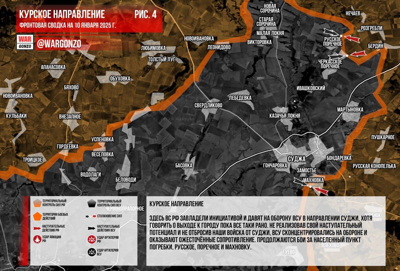 Khu vực Kursk. Tại đây, Lực lượng vũ trang Nga đã nắm bắt được thế chủ động và đang gây sức ép lên tuyến phòng thủ của Lực lượng vũ trang Ukraine theo hướng Sudzha, mặc dù vẫn còn quá sớm để nói về việc tiếp cận thành phố. Không phát huy được tiềm năng tấn công và không đẩy lùi được quân ta khỏi Sudzha, Lực lượng vũ trang Ukraine đã tập trung vào phòng thủ và đang kháng cự quyết liệt. Các trận chiến giành các khu định cư Pogrebki, Russkoye Porechnoye và Makhnovka vẫn tiếp diễn. (Hình 4)