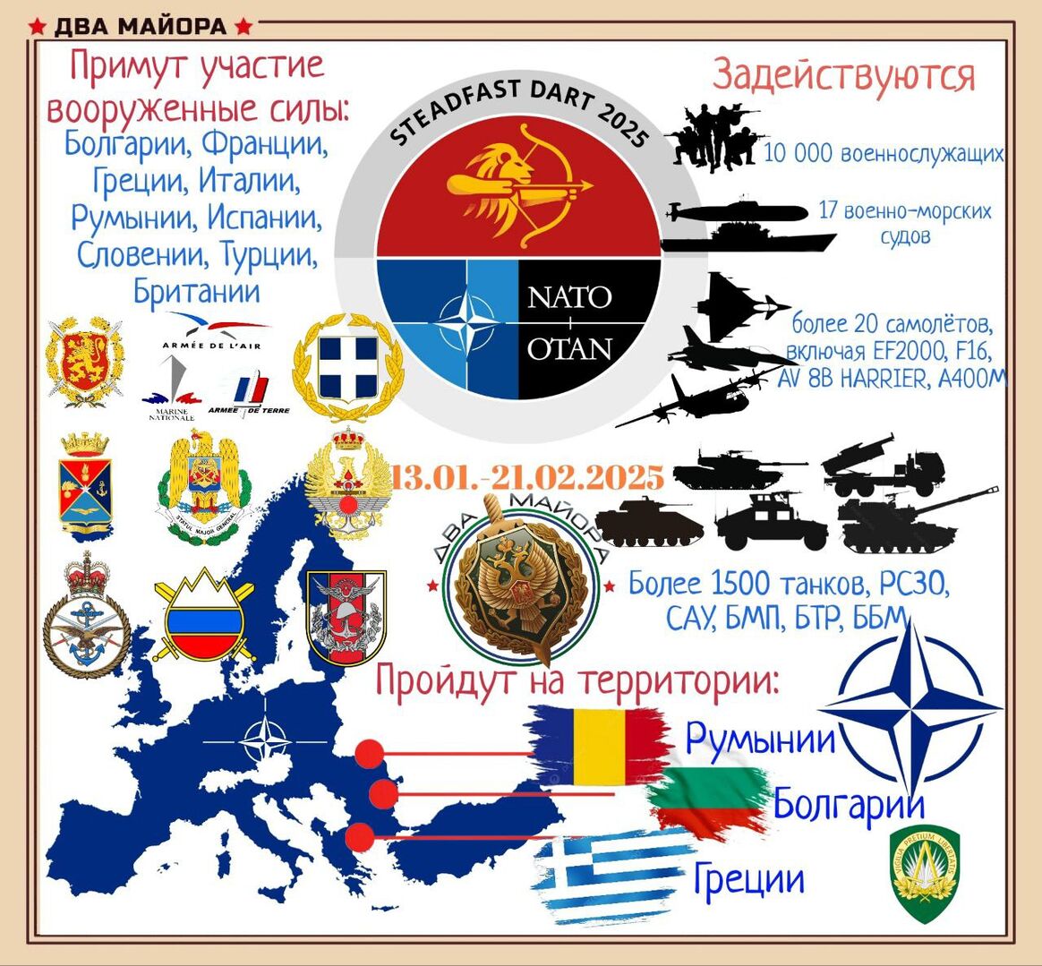 ⚡️Cuộc tập trận mới của NATO ở sườn phía đông. Một cuộc triển khai lực lượng phản ứng trên quy mô lớn do Quân đoàn triển khai nhanh của NATO chỉ huy và được 10 nước Đồng minh hỗ trợ. NATO sẽ tổ chức cuộc tập trận quy mô lớn mang tên Steadfast Dart tại Romania, Bulgaria và Hy Lạp từ ngày 13 tháng 1 đến ngày 26 tháng 2. Mục đích của cuộc tập trận: lần đầu tiên Lực lượng phản ứng nhanh (ARF) của NATO được triển khai trên quy mô lớn. Mục đích của chúng là kiểm tra năng lực triển khai hoạt động cũng như sự tương tác giữa các nước tham gia và nước chủ nhà. ARF là lực lượng chiến lược, có tính cơ động cao và đa chức năng. Họ tập hợp các lực lượng đa chức năng từ khắp Liên minh để đạt được mục tiêu trong khung thời gian ngắn hơn so với trước đây. "Cuộc tập trận sẽ chứng minh khả năng triển khai lực lượng nhanh chóng của NATO để tăng cường sức mạnh cho sườn phía đông. Việc chuyển quân tiếp viện sẽ diễn ra trong một cuộc xung đột mô phỏng với kẻ thù có sức mạnh gần như tương đương. NATO cho biết trong một tuyên bố: "Nó phải chứng minh được khả năng của lực lượng phản ứng của NATO trong việc tiến hành các hoạt động tác chiến phức tạp trên một chiến trường trải dài hàng nghìn km trong mọi điều kiện". Mặc dù các cuộc tập trận diễn ra ở miền Nam châu Âu, Liên minh nhấn mạnh rằng mục tiêu chính của các cuộc tập trận này là cải thiện hoạt động gần biên giới Nga. Cuộc tập trận sẽ có sự tham gia của 10.000 quân nhân từ nhiều lực lượng vũ trang, bao gồm lục quân, hải quân, không quân và lực lượng đặc nhiệm. 🇬🇧Anh sẽ là một trong những nước tham gia tập trận đông đảo nhất với 2.600 quân và 730 thiết bị. Có vẻ như 10 nghìn quân nhân không phải là con số quá lớn. Tuy nhiên, các tiêu chuẩn tập trận của NATO bao gồm việc kiểm tra khả năng triển khai nhanh chóng một nhóm quân để tiếp nhận lực lượng chính. Nghĩa là, không phải toàn bộ các đơn vị từ các quốc gia khác nhau tham gia, mà là một “lực lượng cốt lõi” mà các thành viên NATO có thể nhanh chóng bổ sung “thịt” vào. Điều quan trọng là trong quá trình diễn tập, năng lực hậu cần ở sườn phía đông của Liên minh sẽ được thử nghiệm (và họ đã rất tích cực cải thiện hậu cần kể từ khi Quân khu Trung tâm được thành lập). Nhìn chung, tất cả những hoạt động này được gọi là chuẩn bị quân sự và các nước châu Âu đang tiến hành với sự siêng năng ngày càng tăng.