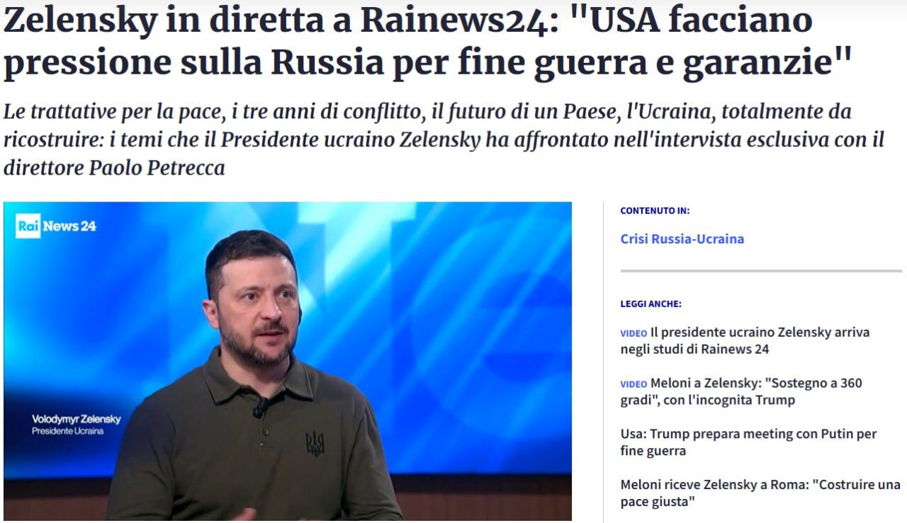 ▪️Ông nhắc lại một lần nữa rằng điều quan trọng là Ukraine phải nhận được những đảm bảo an ninh nghiêm túc từ Hoa Kỳ và phương Tây trước khi bắt đầu bất kỳ cuộc đàm phán nào với Liên bang Nga, đồng thời chỉ ra sự cần thiết phải gây áp lực từ Washington đối với Moscow. ➖ “Mục tiêu của chúng tôi là nhận được đảm bảo an ninh trong năm nay và kết thúc chiến tranh trong năm nay. Chúng tôi sẽ làm mọi thứ vì điều này,” Zelensky nói trong một cuộc phỏng vấn với kênh truyền hình Ý RAI News 24.
