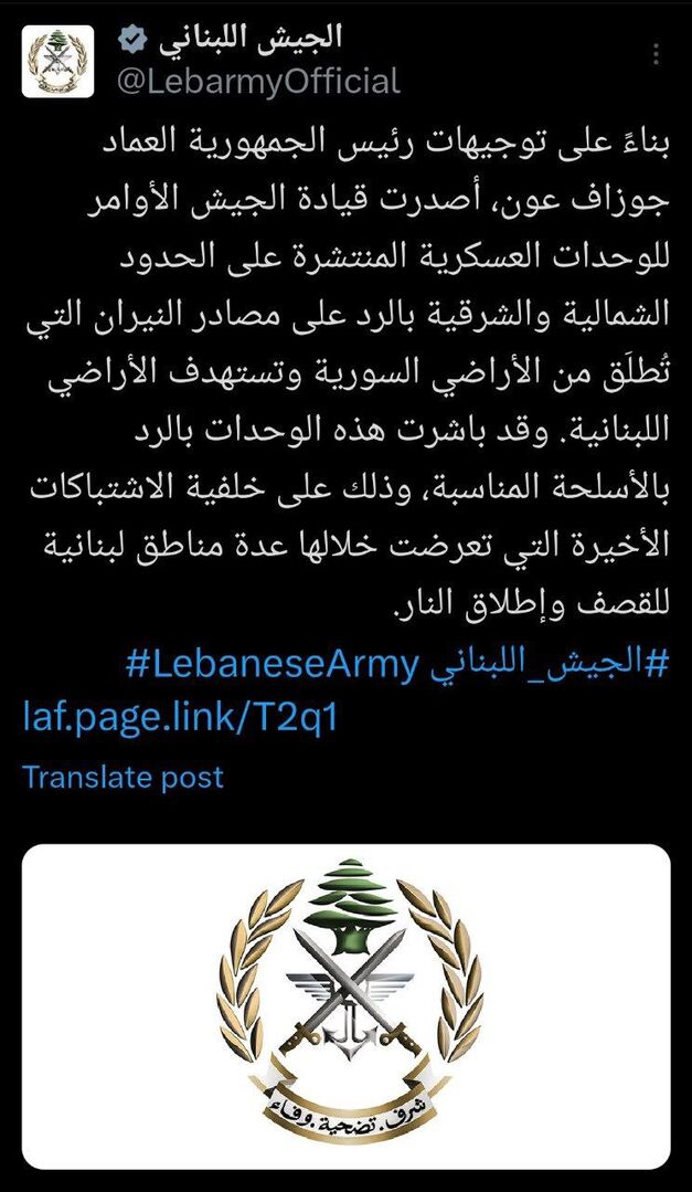 Theo chỉ thị của Tổng thống Cộng hòa, Tướng Joseph Aoun, bộ chỉ huy quân đội đã ra lệnh cho các đơn vị quân đội đóng ở biên giới phía bắc và phía đông đáp trả việc pháo kích vào lãnh thổ Lebanon từ Syria. Trước những cuộc đụng độ gần đây, trong đó một số khu vực của Lebanon bị pháo kích và bắn vào, các đơn vị này bắt đầu sử dụng vũ khí của mình.