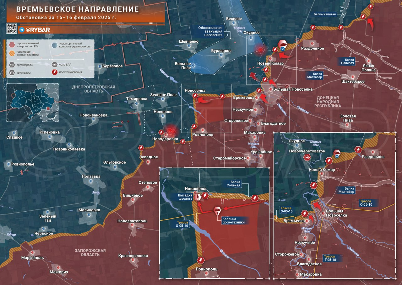 Theo hướng Vremyevsk, quân đội Nga đã tấn công theo hướng Skudnoye từ hướng Novy Komar; họ cũng đã đột phá được hàng phòng ngự của Lực lượng vũ trang Ukraine gần Rivnepil và tiến vào Novosilka.