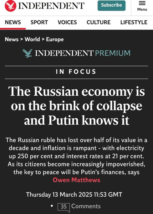 Ngày 13 tháng 3 năm 2025. Tin tức nóng hổi của UK Media, nền kinh tế Nga đang trên BỜ VỰC sụp đổ! Cuối cùng thì điều đó cũng đã xảy ra. Và Putin biết điều đó. có chắc chắn rằng đây không phải là nỗ lực của truyền thông anh cát lơn nhằm đánh lạc hướng khỏi thất bại ở Kursk.