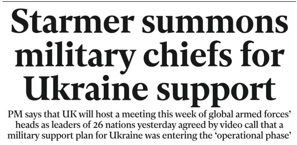 Theo The Times, hơn 35 quốc gia đã đồng ý cung cấp vũ khí, vật tư, hỗ trợ kỹ thuật và tình báo cho "sứ mệnh châu Âu tiềm năng" - gìn giữ hòa bình tại Ukraine.