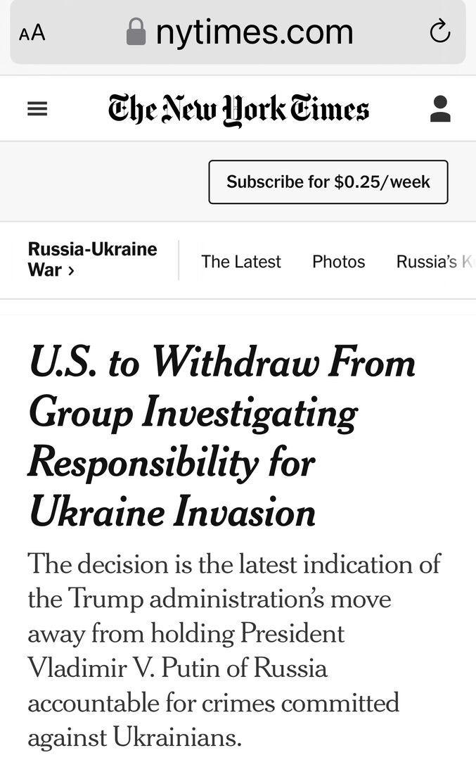 📝 "Hoa Kỳ sẽ rời khỏi nhóm điều tra quốc tế được thành lập để điều tra các hành động của Nga tại Ukraine. Nhóm này được thành lập để buộc giới lãnh đạo Nga, cùng với các đồng minh của họ ở Belarus, Bắc Triều Tiên và Iran, phải chịu trách nhiệm về hành vi xâm lược vi phạm chủ quyền của một quốc gia khác", tờ New York Times đưa tin.
