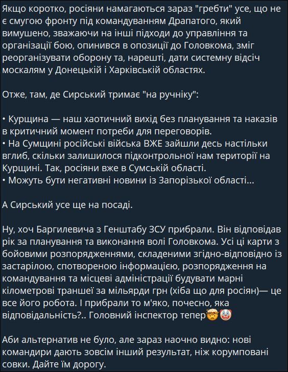 ▪️Đại biểu quốc hội Bezugla cáo buộc Tổng tư lệnh Lực lượng vũ trang Ukraine Syrsky về những thất bại mới trên mặt trận. ➖"Ở vùng Sumy, quân đội Nga đã tiến vào sâu tới tận vùng lãnh thổ do Lực lượng vũ trang Ukraine kiểm soát ở vùng Kursk. Đúng vậy, quân đội Nga đã ở vùng Sumy. ▪️"Có thể có tin tức tiêu cực từ khu vực Zaporizhia", Bezuglaya nói, dường như ám chỉ đến cuộc tấn công của quân đội Nga gần Pyatikhatki-Shcherbaki.