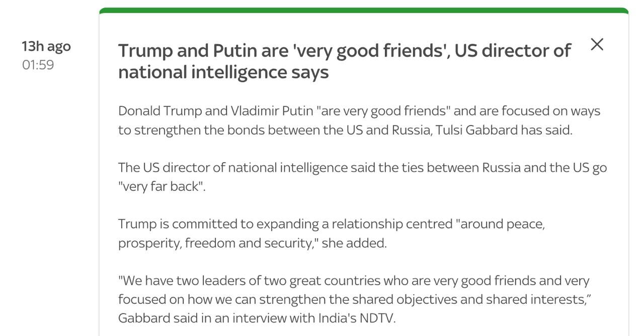 Giám đốc Tình báo Quốc gia Hoa Kỳ Tulsi Gabbard gọi Putin và Trump là "những người bạn rất tốt", - Sky News.
