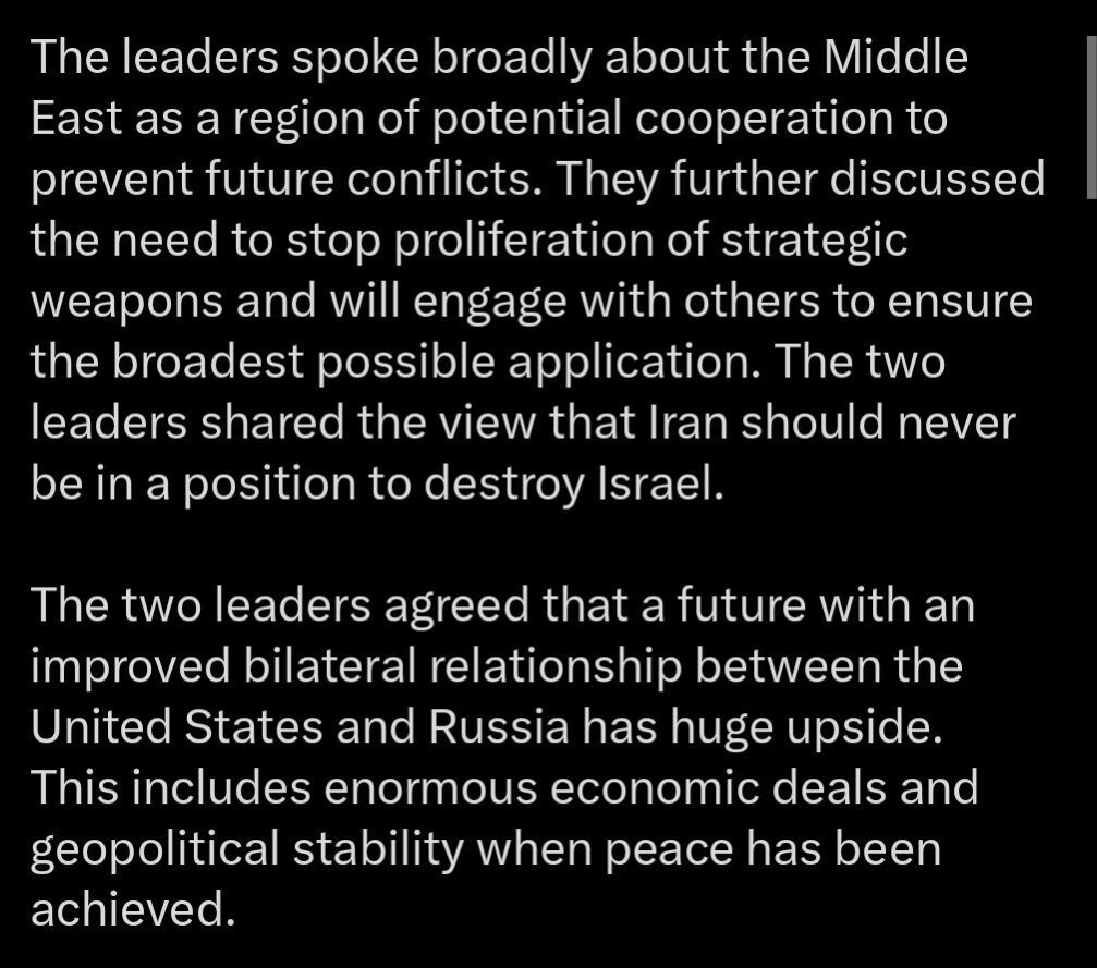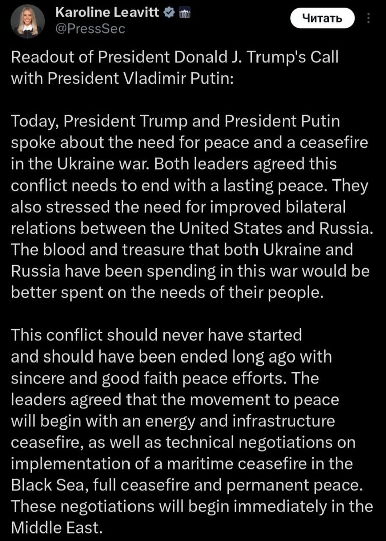 “Hôm nay, Tổng thống Trump và Tổng thống Putin đã thảo luận về nhu cầu hòa bình và ngừng bắn trong cuộc chiến ở Ukraine. Cả hai nhà lãnh đạo đều nhất trí rằng cuộc xung đột này phải kết thúc bằng một nền hòa bình lâu dài. Họ cũng nhấn mạnh tầm quan trọng của việc cải thiện quan hệ song phương giữa Hoa Kỳ và Nga. Máu và tài nguyên mà Ukraine và Nga đang chi cho cuộc chiến này có thể được chuyển hướng tới nhu cầu của người dân nước họ.