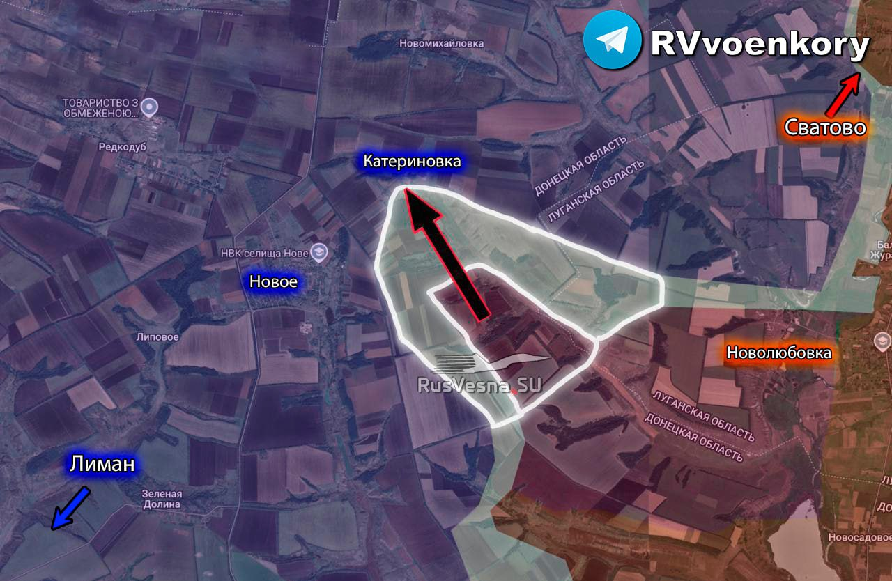 ▪️Nhóm lực lượng "phương Tây" tiếp tục phát triển cuộc tấn công theo hướng Krasnolimansky trên biên giới DPR và LPR. ▪️Sau khi giải phóng Balka Zhuravka, Ivanovka và Novolyubovka ở phía đông nam, quân đội Nga đã đột nhập vào Katerinovka và đang tấn công ngôi làng. ▪️5 ngày trước có thông tin cho biết, theo hướng Liman, lực lượng của chúng tôi đã tiến vào khu vực khe núi Blizhniy trên một khu vực rộng tới 2,1 km và sâu tới 1 km.